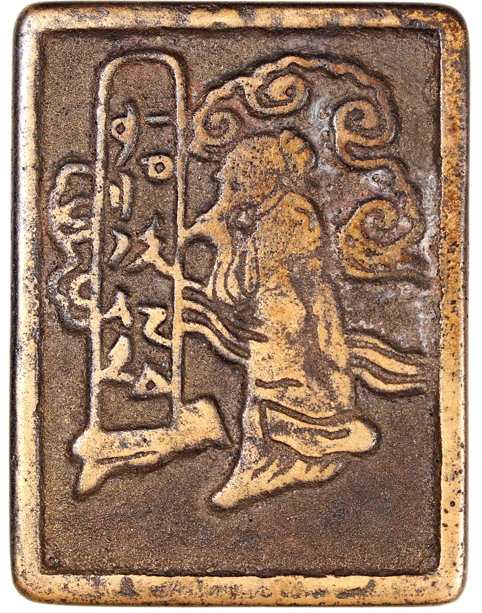 China: Song-Yuan Dynasty (960-1368 CE), plaque-shaped charm, obverse showing calligraphing scholar, reverse inscribed 'Shi xian' and a poem, 37.3*2.2mm, 14.8g. Very fine.