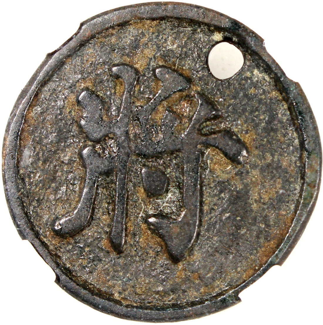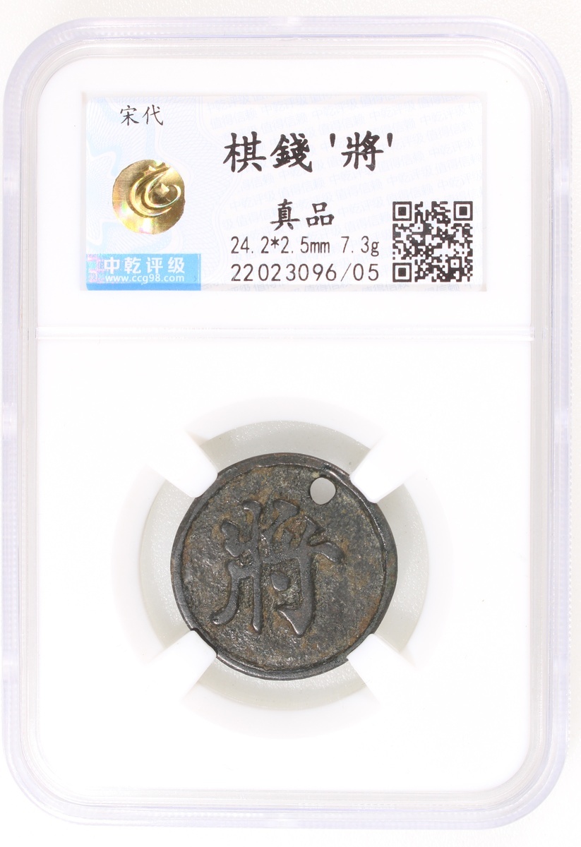 China: Song Dynasty (960-1279 CE), coin-shaped chess charm, obverse inscribed 'Jiang', reverse showing human figure in armour holding sword, 24.2*2.5mm, 7.3g, Zhong Qian Genuine. Very fine, rare.