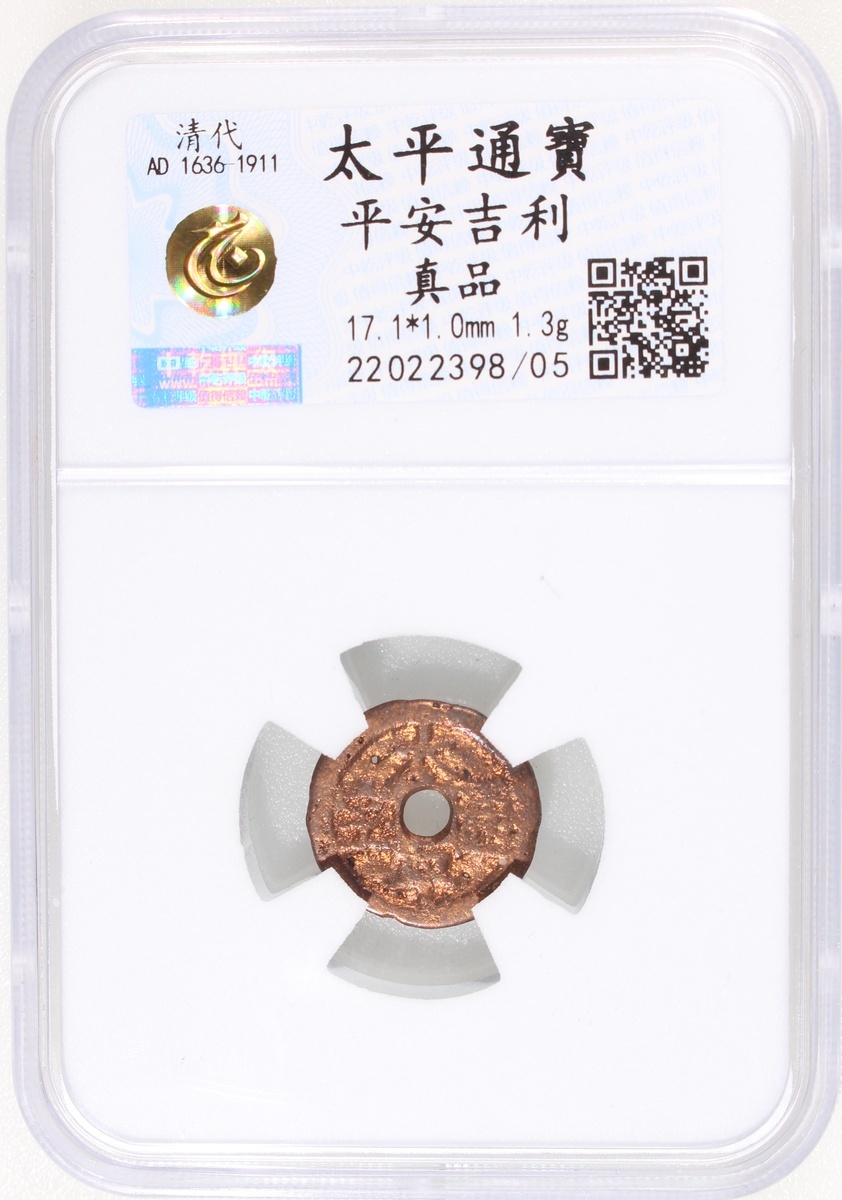 太平通寶圓穿花錢,背“平安吉利”,清朝(公元1644–1911),17.1*1.0mm,重1.3g,中乾真品。