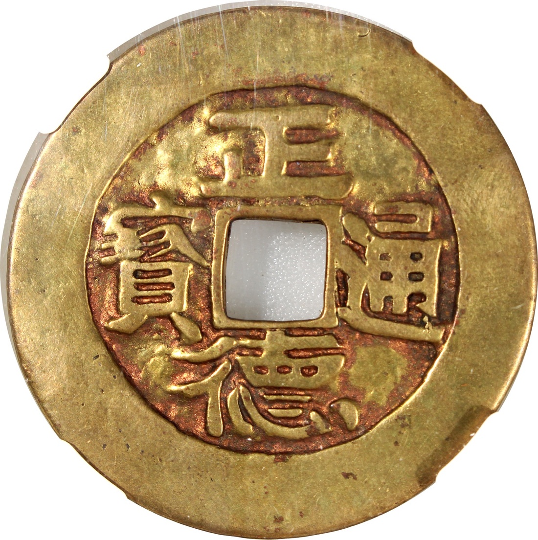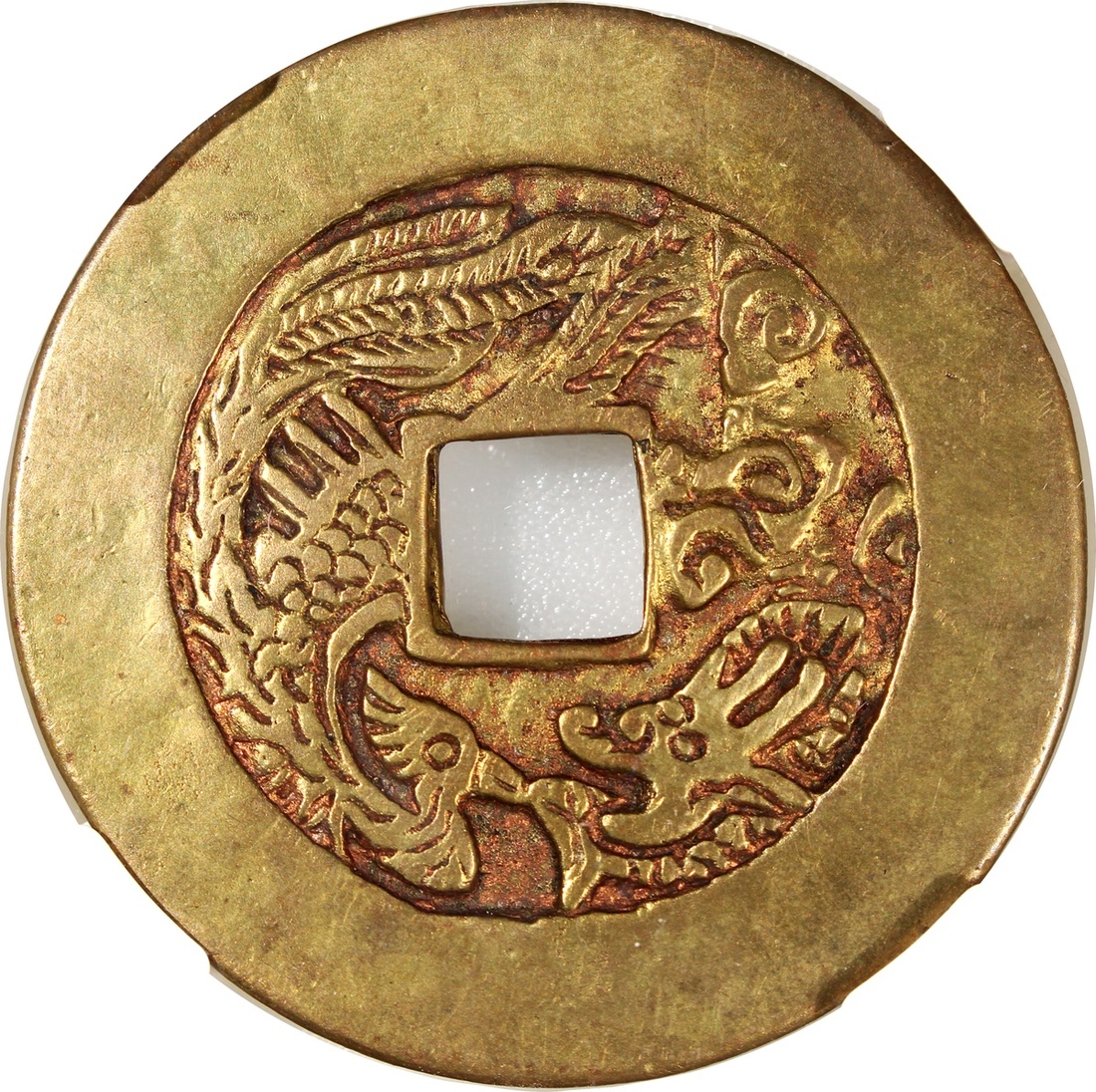 China: Qing Dynasty (1644-1911 CE), coin-like charm with square central hole, obverse inscribed 'Zheng de tong bao', reverse showing dragon and phoenix, 44.5*1.8mm, 20.0g, Zhong Qian 82. Excellent condition, scarce.
