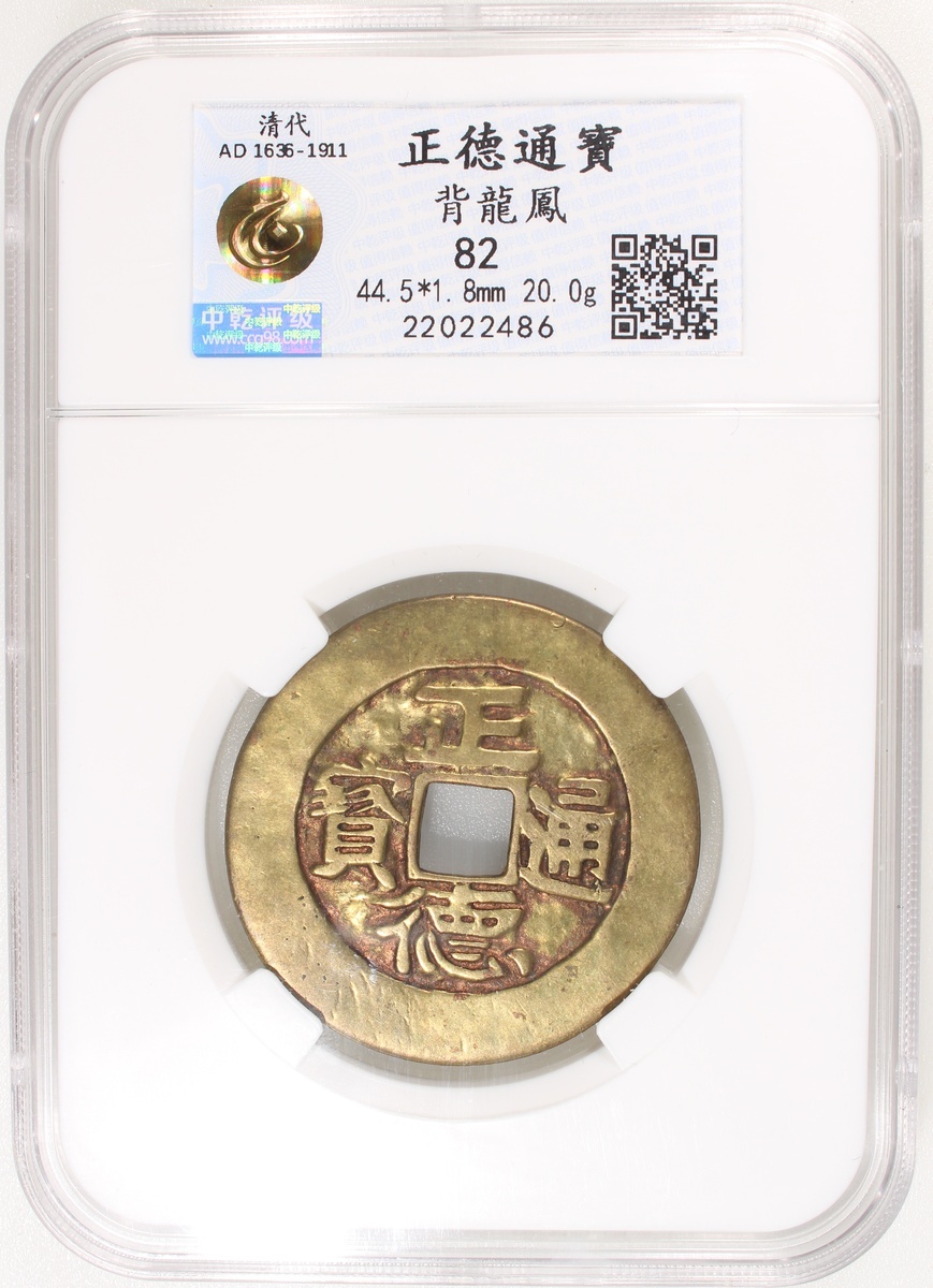 正德通寶方穿錢文花錢,背龍鳳,清朝(公元1644–1911),44.5*1.8mm,重20.0g,中乾評分82。品相極美,少見。