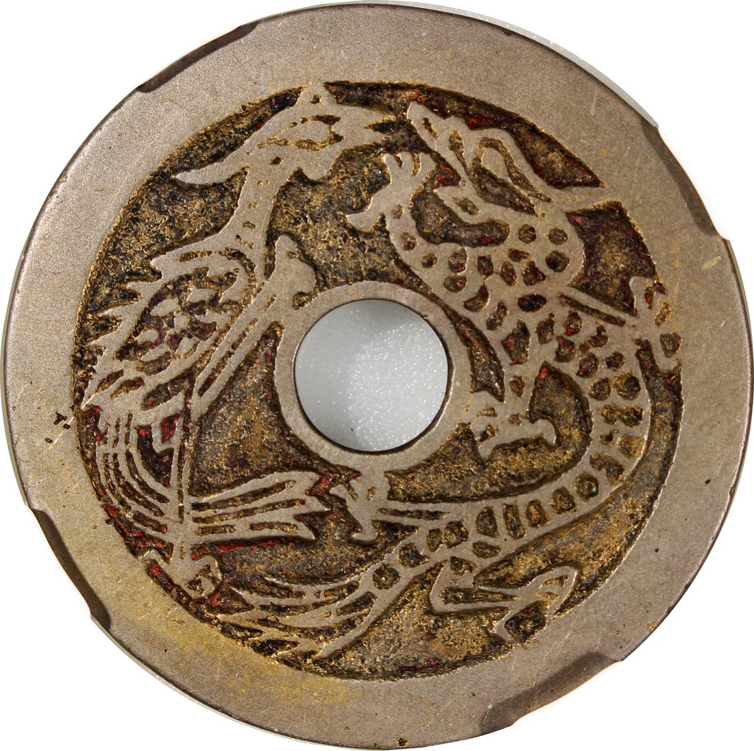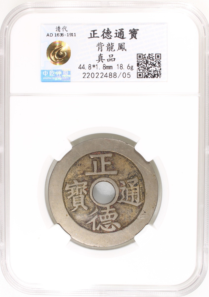 China: Qing Dynasty (1644-1911 CE), coin-like charm with round central hole, obverse inscribed 'Zheng de tong bao', reverse showing dragon and phoenix, 44.8*1.8mm, 18.6g, Zhong Qian Genuine. Excellent condition, nice calligraphy, scarce.