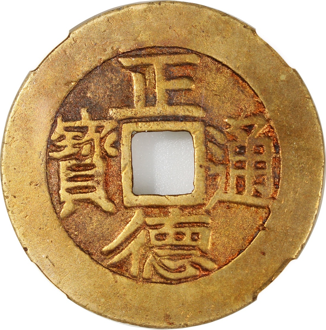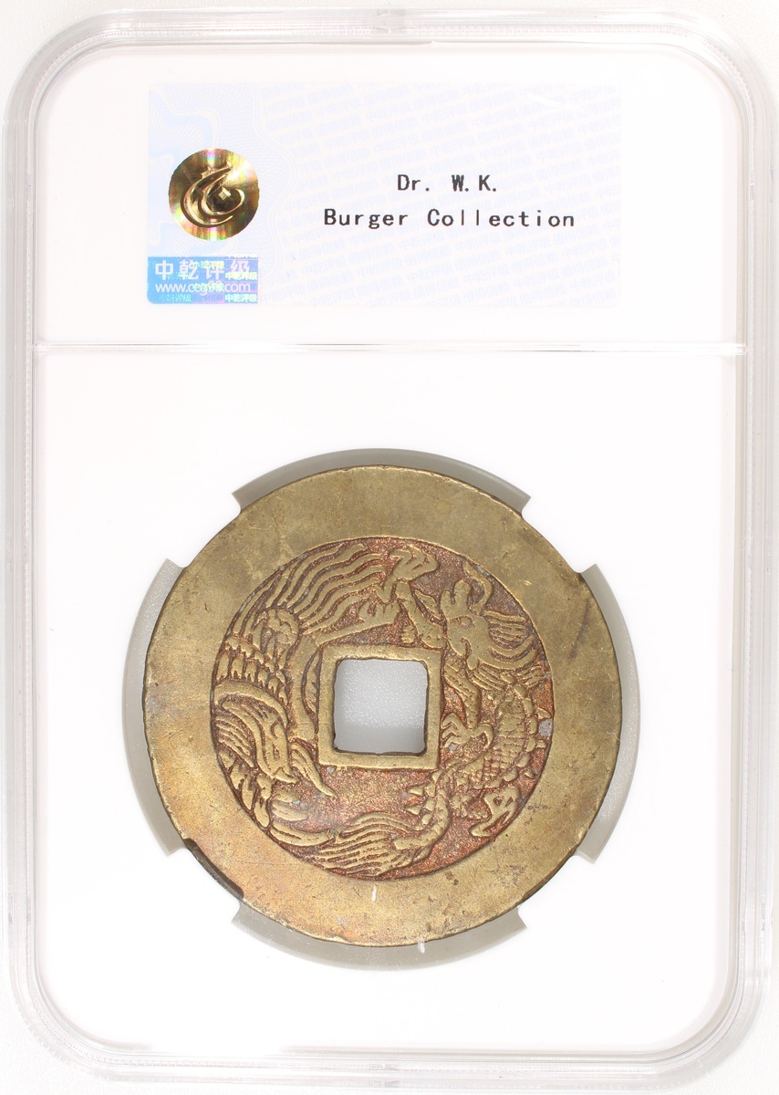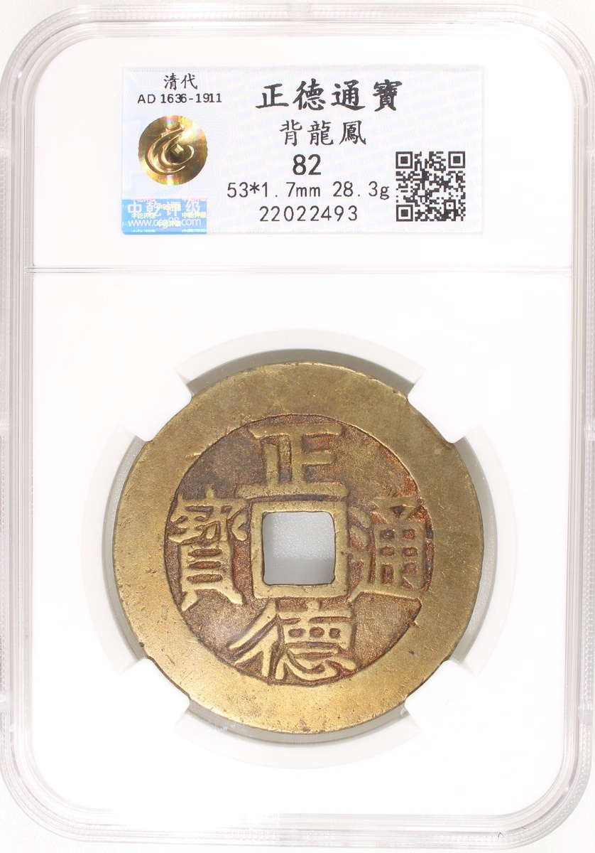 桂爐正德通寶方穿錢文花錢,背龍鳳,清朝(公元1644–1911),53.1x1.7mm,重28.3g,中乾評分82。品相極美,少見。