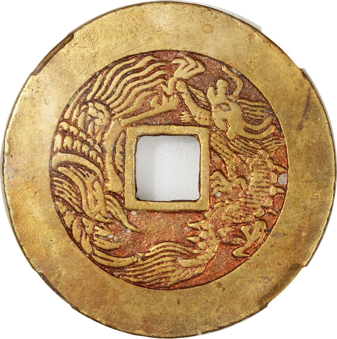 China: Qing Dynasty (1644-1911 CE), coin-like charm with square central hole, Guangxi Mint production, obverse inscribed 'Zheng de tong bao', reverse showing dragon and phoenix, 53.1x1.7mm, 28.3g, Zhong Qian 82. Excellent condition, scarce.