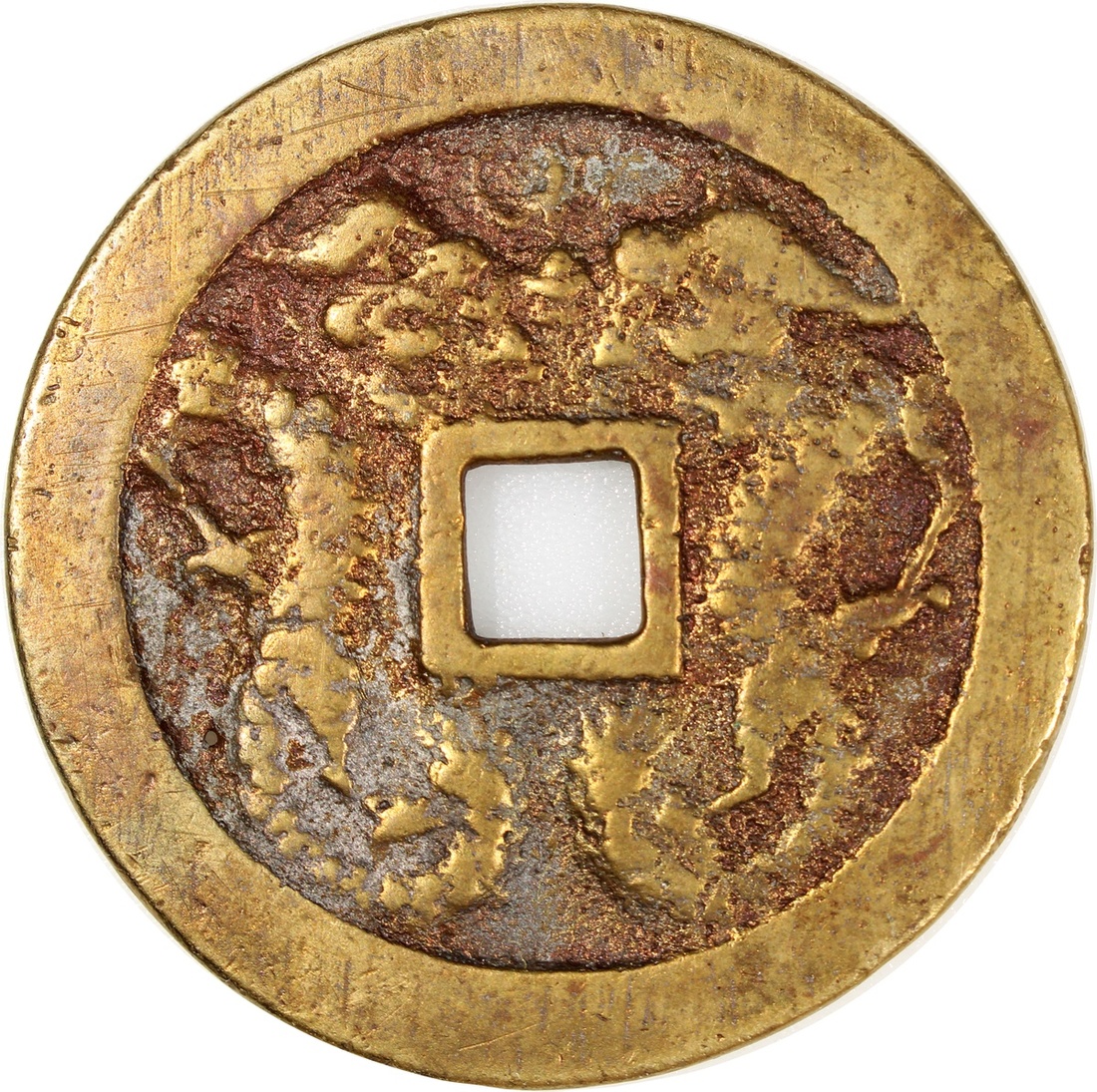 China: Qing Dynasty (1644-1911 CE), coin-like charm with square central hole, obverse inscribed 'Zheng de tong bao', reverse showing double dragons, 53.1*2.9mm, 38.5g.