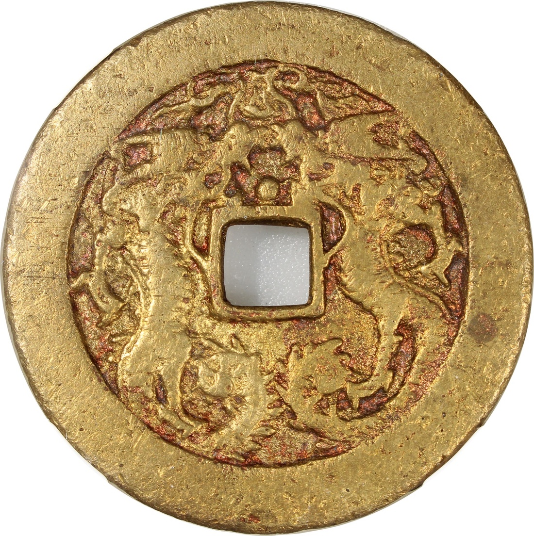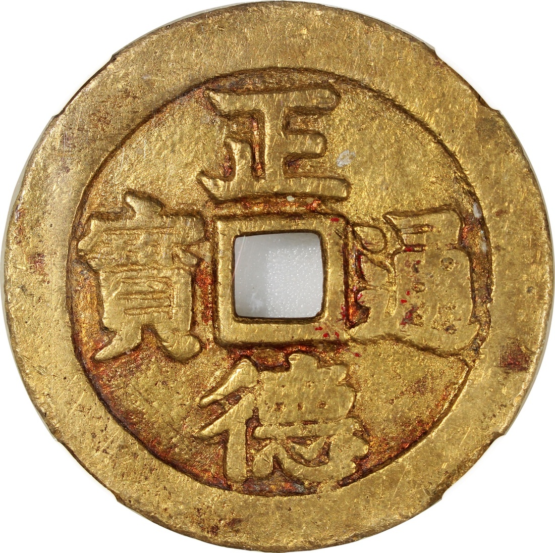 China: Qing Dynasty (1644-1911 CE), coin-like charm with square central hole, obverse inscribed 'Zheng de tong bao', reverse showing double dragons, 53.4*3.1mm, 41.9g, Zhong Qian 78.