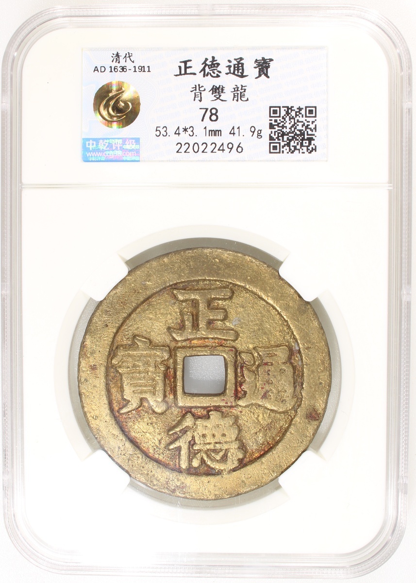 正德通寶方穿錢文花錢,背雙龍,清朝(公元1644–1911),53.4*3.1mm,重41.9g,中乾78。