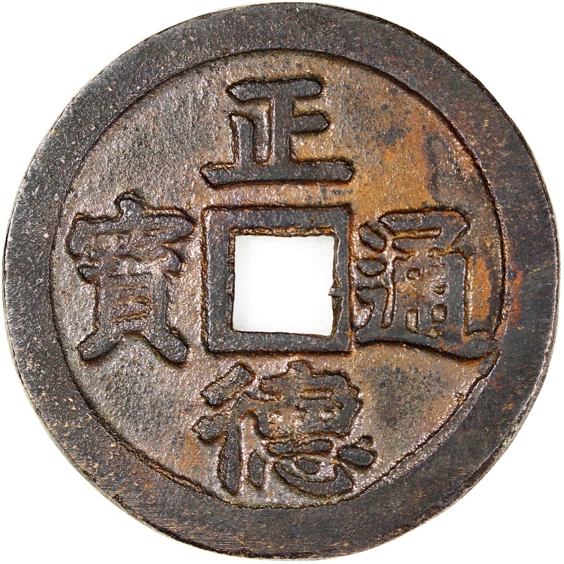 China: Republican Period (1911-1949 CE), coin-like charm with square central hole, obverse inscribed 'Zheng de tong bao', reverse inscribed 'Fu shou' with flowers, 45.4*2.3mm, 25.4g. Note: This piece is previously published as No 703 in Wan qian ji by Chen Hongxi (Taizhong 1987).
