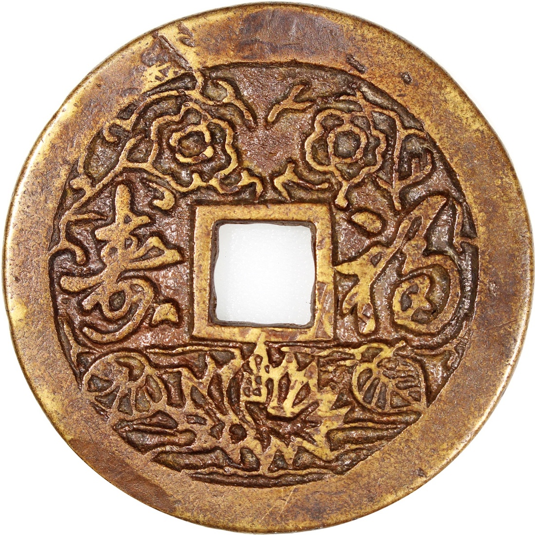 China: Qing Dynasty (1644-1911 CE), coin-like charm with square central hole, obverse inscribed 'Zheng de tong bao', reverse inscribed 'Fu shou' with flowers, 44.9*2.6mm, 25.0g.