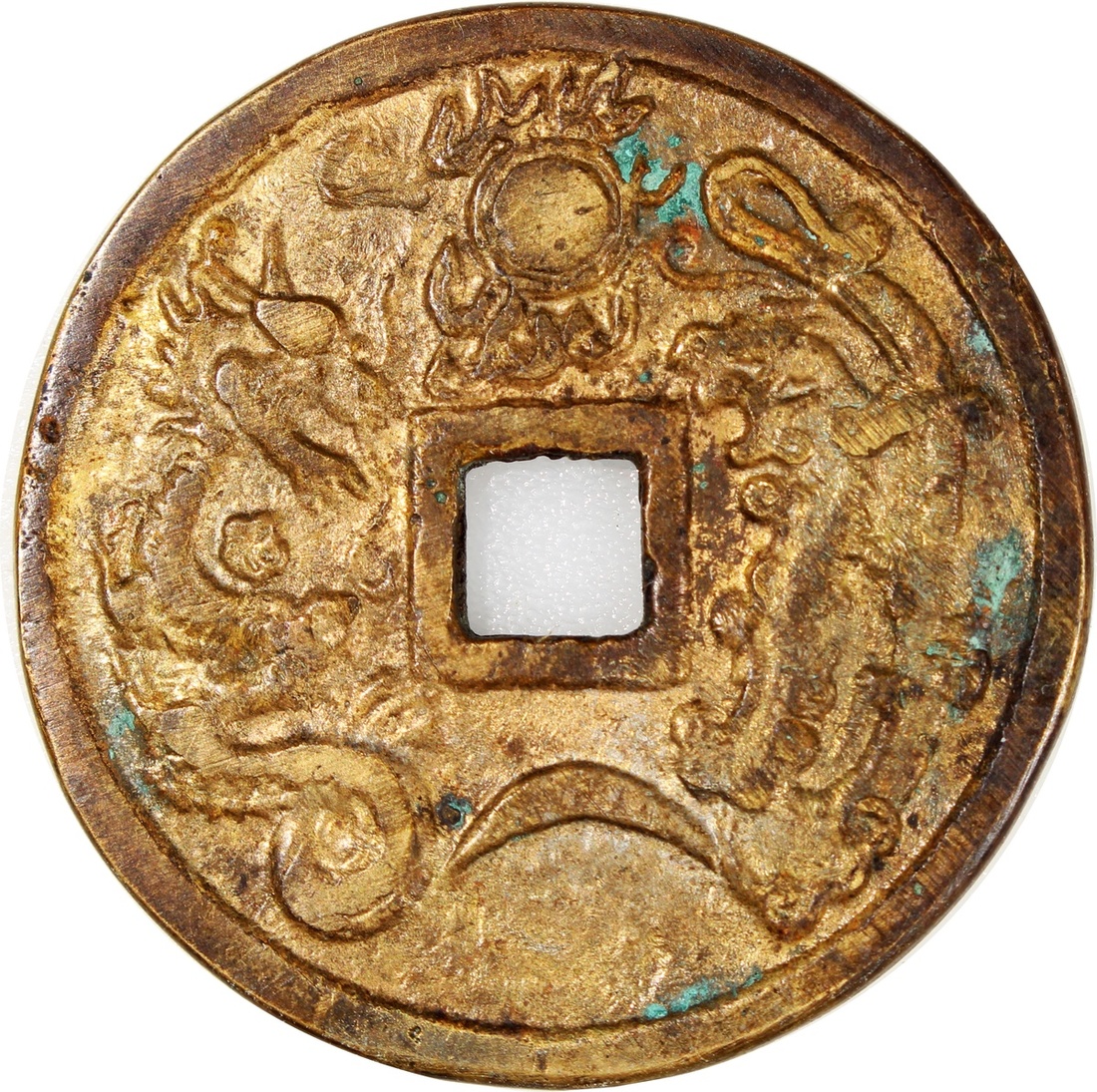 China: Qing Dynasty (1644-1911 CE), coin-like charm with square central hole, obverse inscribed 'Zheng de tong bao', reverse showing two dragons with Sun and Moon, 38.4*1.9mm, 14.6g.
