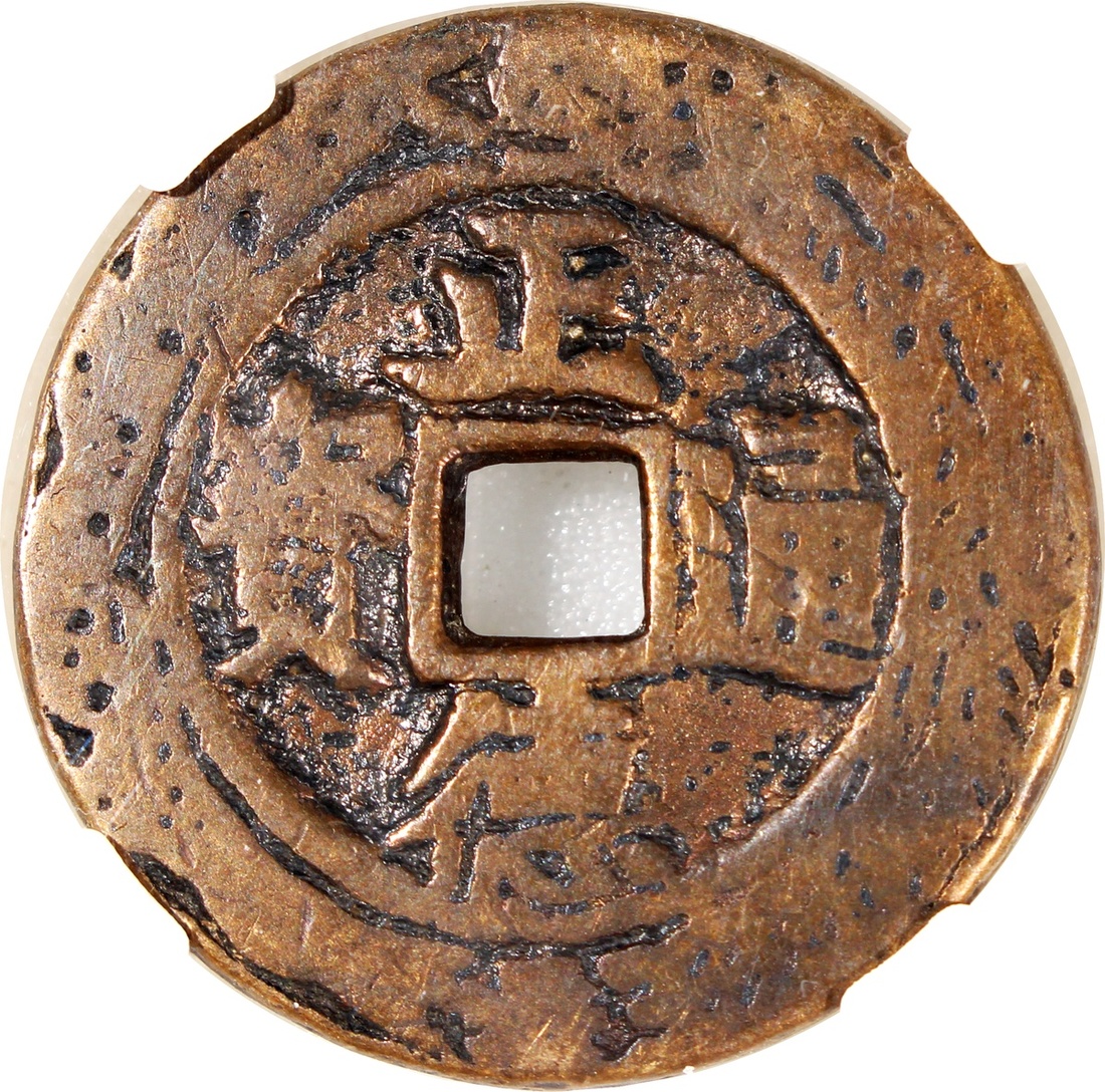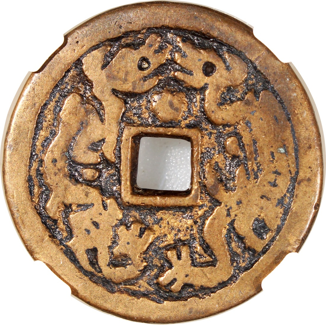 China: Qing Dynasty (1644-1911 CE), coin-like charm with square central hole, obverse inscribed 'Zheng de tong bao', reverse showing two dragons, 30.7*2.4mm, 13.3g, Zhong Qian 78