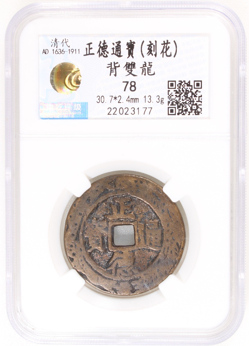 正德通寶方穿錢文花錢,背雙龍,清朝(公元1644–1911),30.7*2.4mm,重13.3g,中乾78。