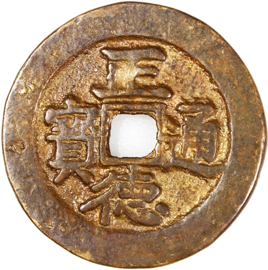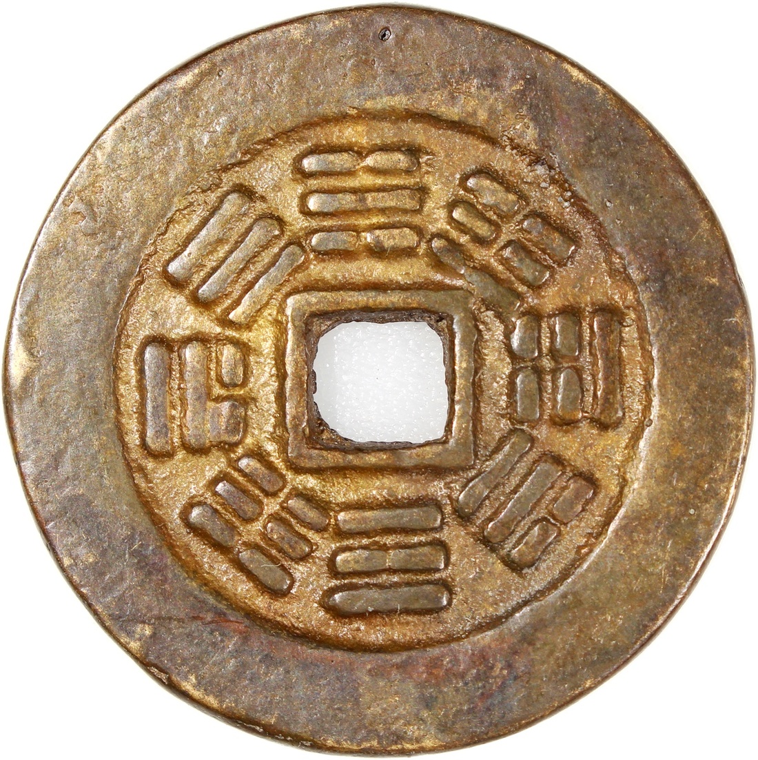China: Qing Dynasty (1644-1911 CE), coin-like charm with square central hole, obverse inscribed 'Zheng de tong bao', reverse showing Bagua, 34.9*2.6mm, 14.9g.