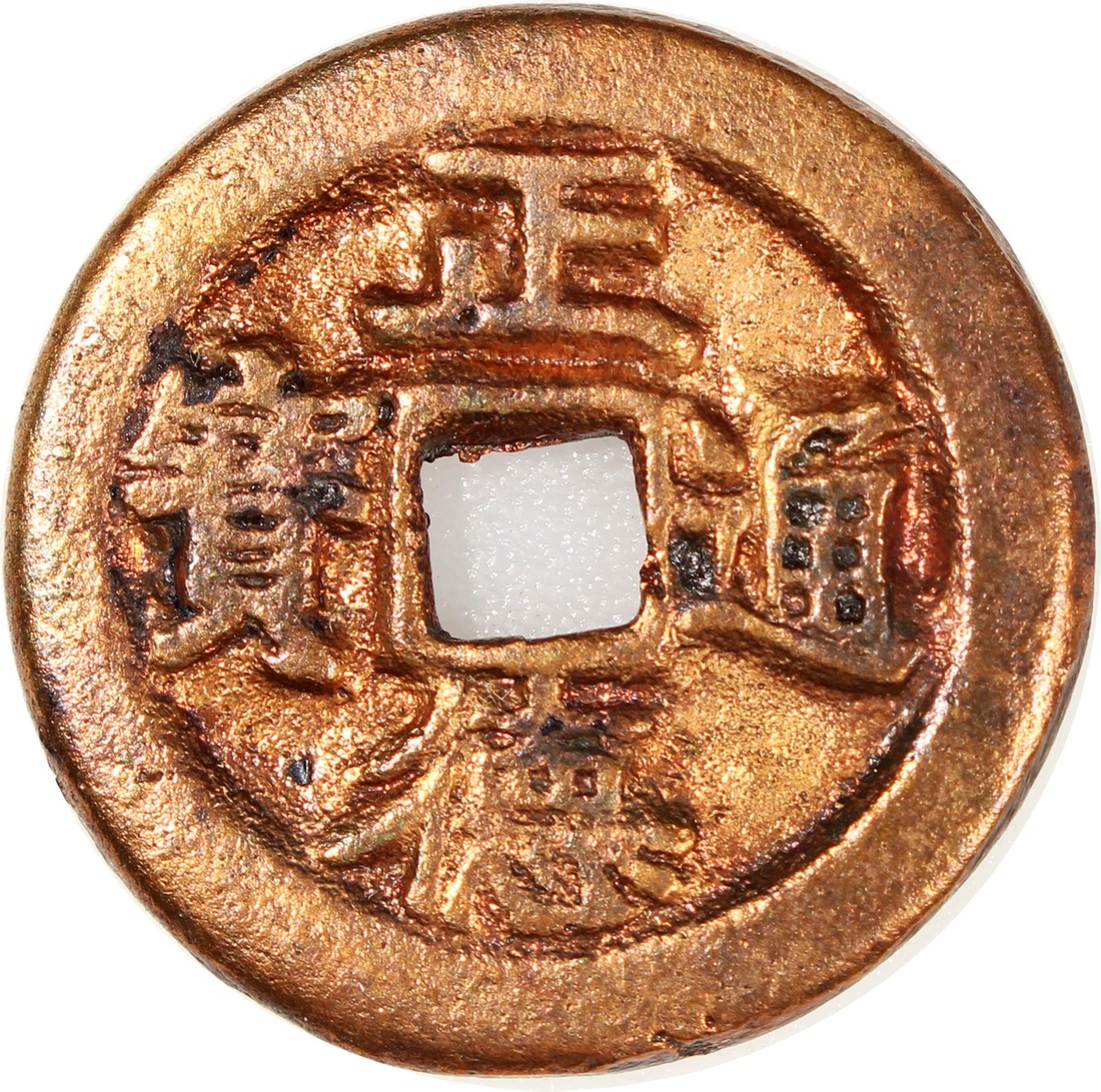 China: Qing Dynasty (1644-1911 CE), coin-like charm with square central hole, obverse inscribed 'Zheng de tong bao', reverse showing dragon and phoenix, 26.1*2.2mm, 7.0g.