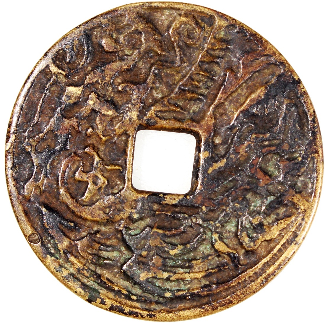 China: Qing Dynasty (1644-1911 CE), coin-like charm with square central hole, obverse inscribed 'Zheng de tong bao', reverse showing dragon and phoenix, 29.5*1.7mm, 6.6g.