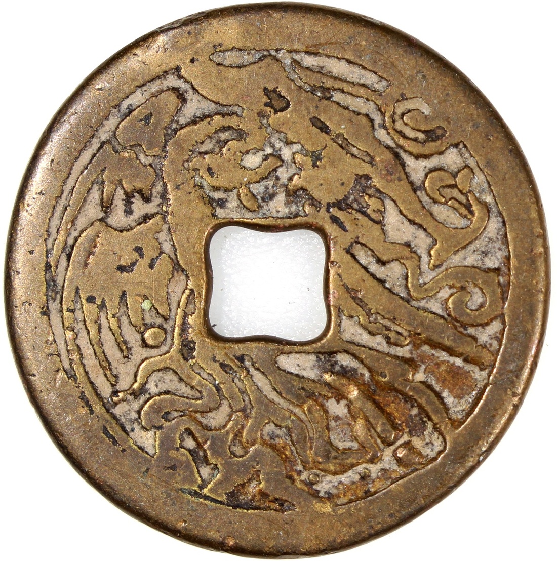 China: Qing Dynasty (1644-1911 CE), coin-shaped charm with square central hole, obverse inscribed 'Tai ping tong bao' in seal script, reverse showing dragon and phoenix, 33.0*1.9mm, 11.1g. Extremely fine, rare.