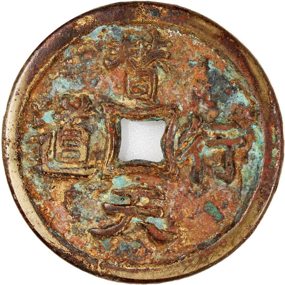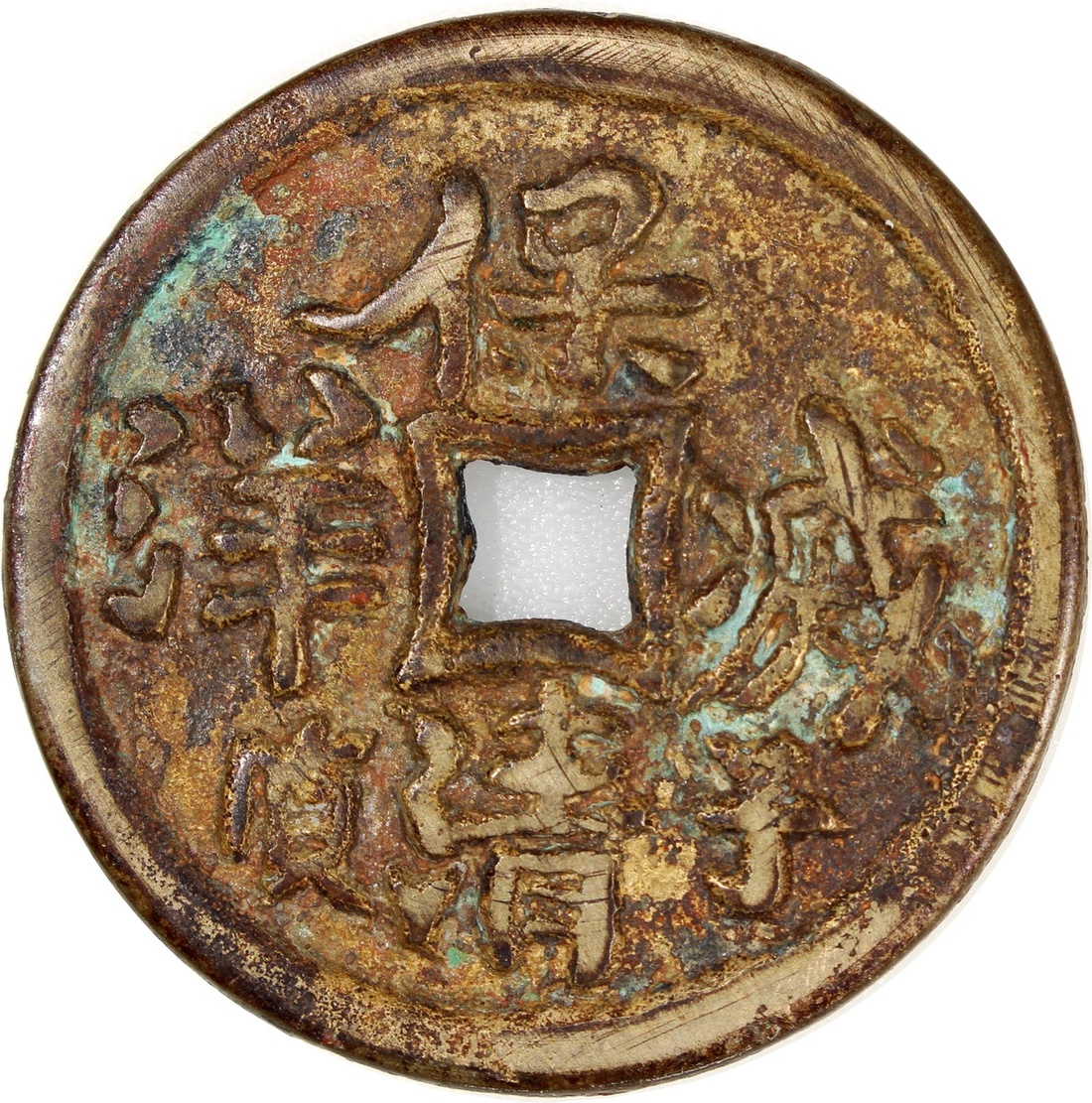China: Qing Dynasty (1644-1911 CE), coin-shaped charm with diamond central hole, obverse inscribed 'Ti tian xing dao', reverse inscribed 'Geng zi bao qing mie yang', 38.9*2.9mm, 22.8g.