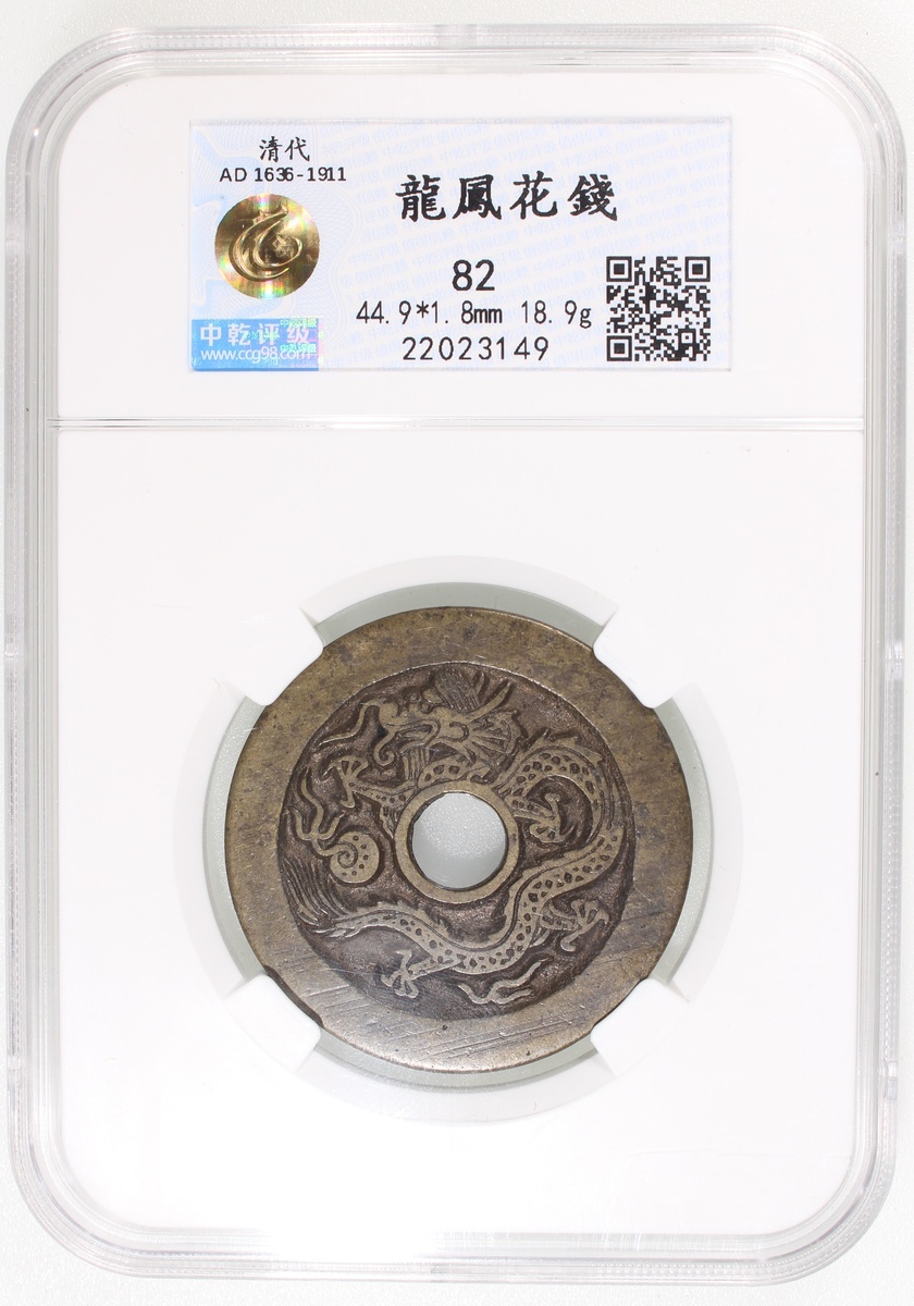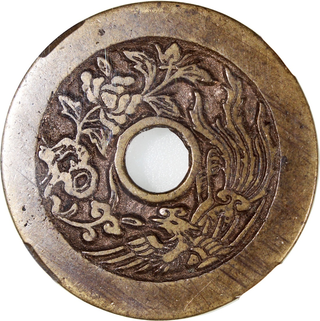 China: Qing Dynasty (1644-1911 CE), coin-shaped charm with round central hole, Jiangsu mint production, obverse showing dragon, reverse showing phoenix in flowers, 44.9*1.8mm, 18.9g, Zhong Qian 82. Extremely fine, rare.