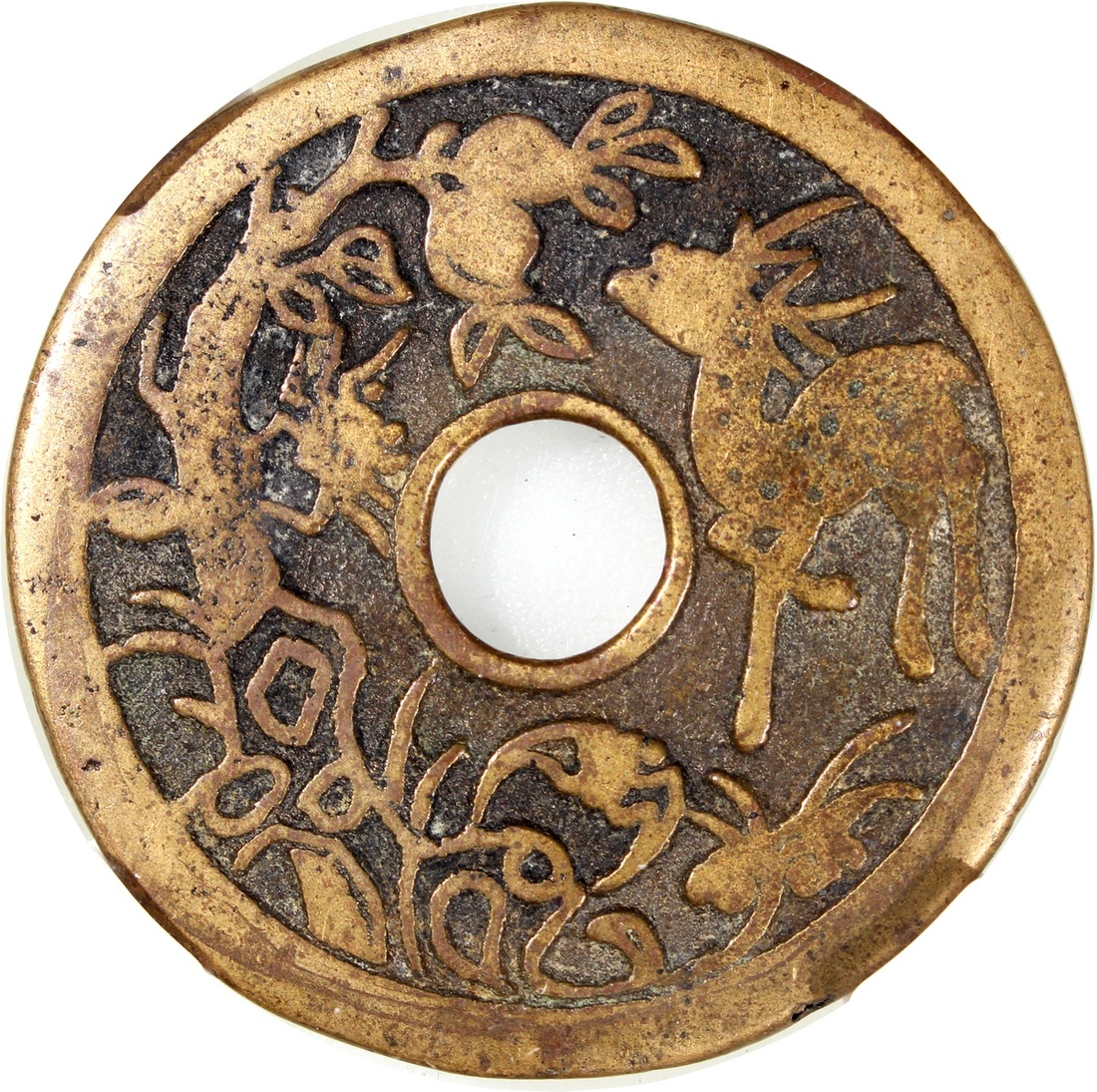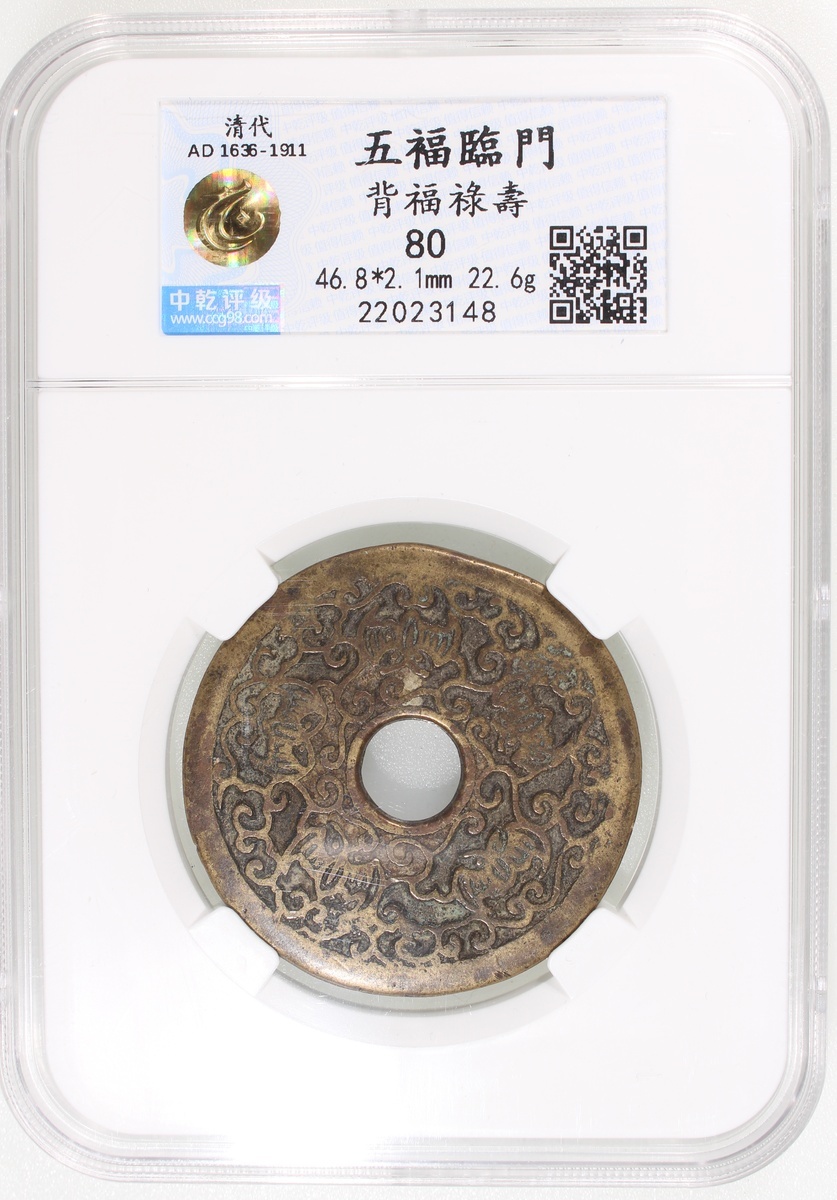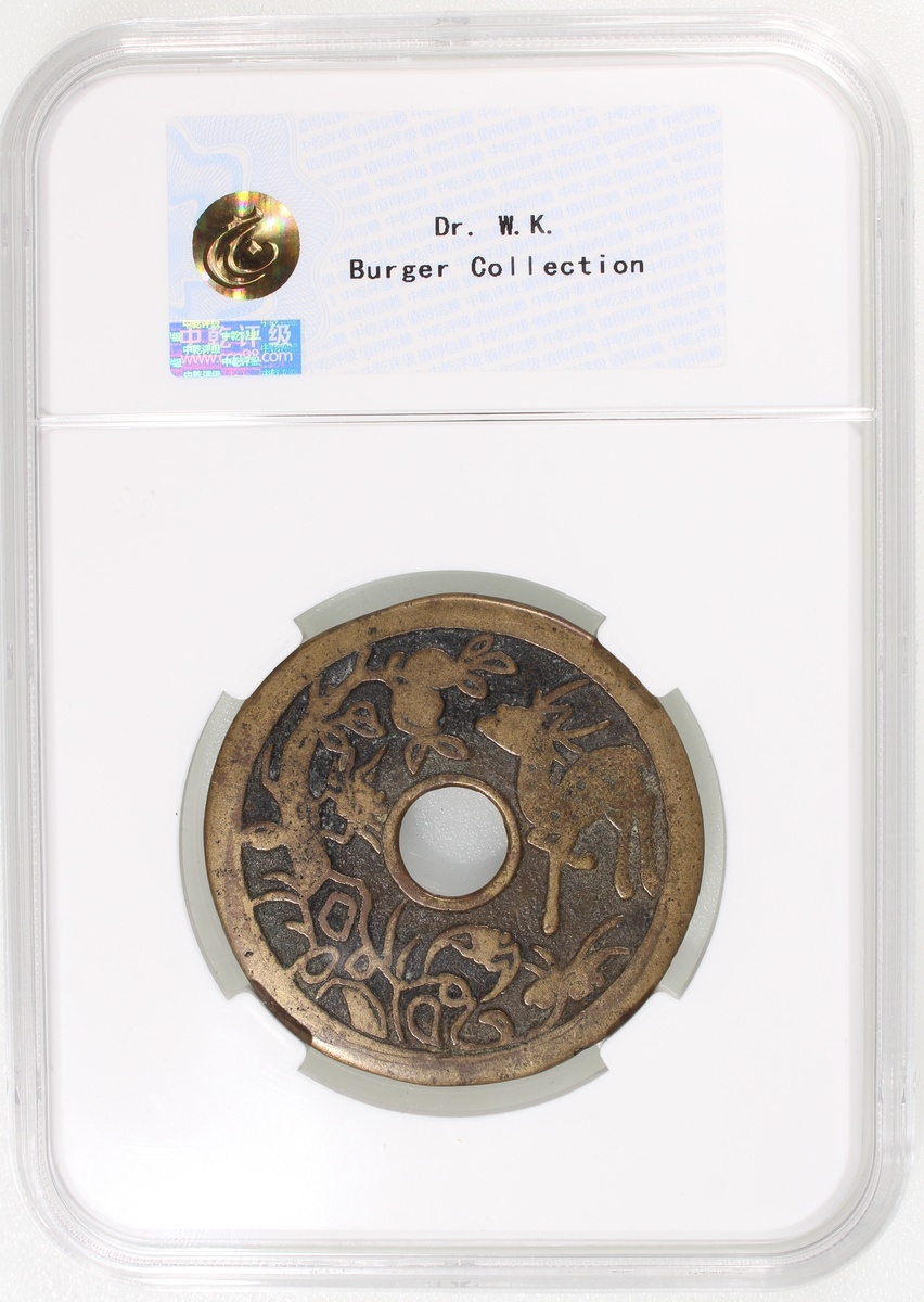 China: Qing Dynasty (1644-1911 CE), coin-shaped charm with round central hole, Jiangsu mint production, obverse showing bat, deer, peach, and spider, reverse showing five stylised bats, 46.8*2.1mm, 22.6g, Zhong Qian 80. Extremely fine, extremely rare, characteristic of Jiangsu mint production that is fine and artistic.