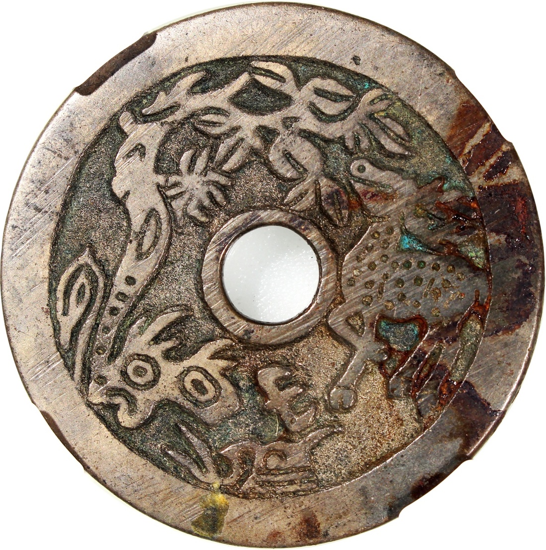 China: Qing Dynasty (1644-1911 CE), coin-shaped charm with round hole, obverse inscribed 'Chang ming fu gui jin yu man tang' decorated with assorted treasures, reverse showing deer and crane in flowers, 47.4*2.3mm, 26.9g, Zhong Qian Genuine. Extremely fine, very rare edition.