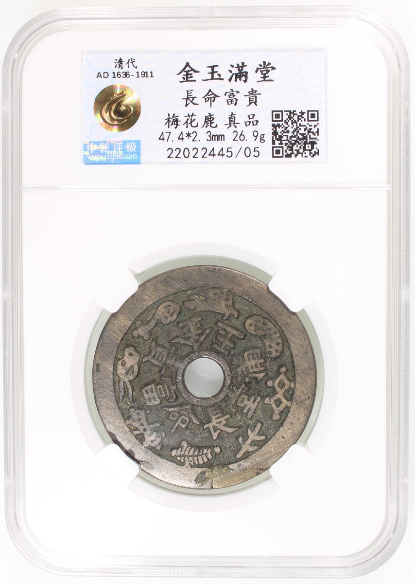 長命富貴金玉滿堂圓穿花錢,背鶴鹿同春,清朝(公元1644–1911),47.4*2.3mm,重26.9g,中乾真品。品相極美,少見版。