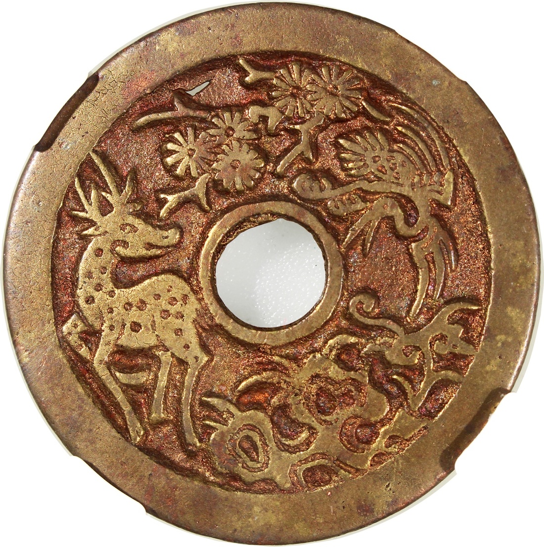 China: Qing Dynasty (1644-1911 CE), coin-shaped charm with round hole, Jiangsu mint production, obverse inscribed 'Chang ming fu gui jin yu man tang' decorated with assorted treasures, reverse showing deer and crane in flowers, 45.6*2.0mm, 21.4g, Zhong Qian Genuine. Extremely fine example.