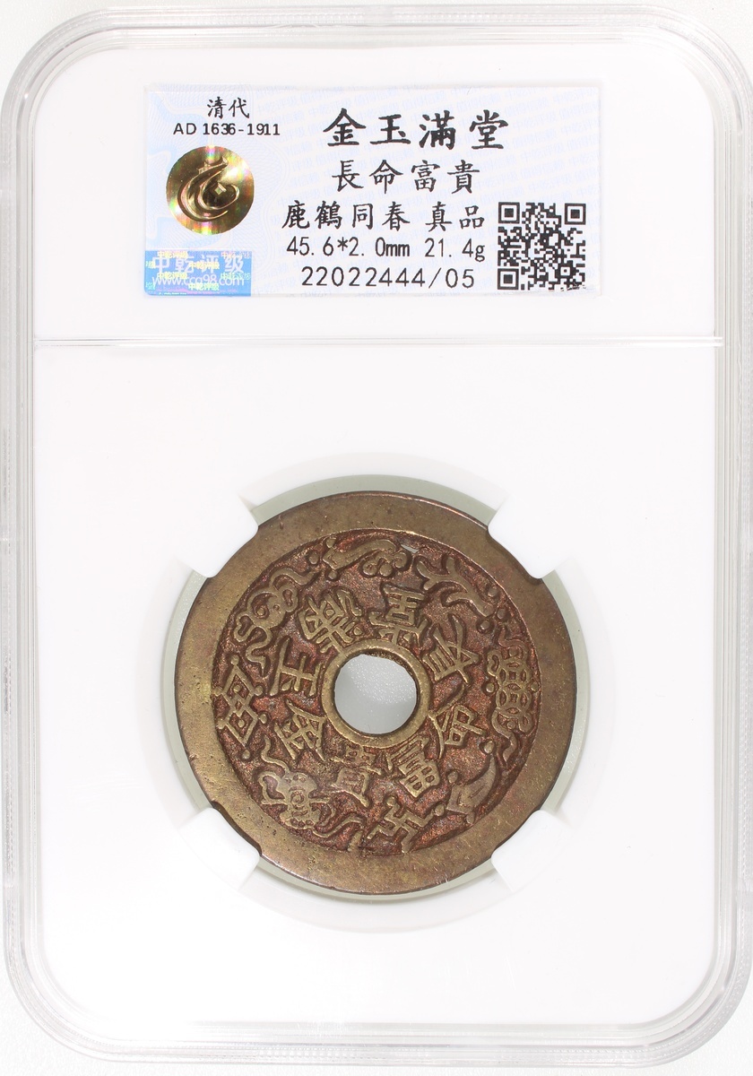 蘇爐長命富貴金玉滿堂圓穿花錢,背鶴鹿同春,清朝(公元1644–1911),45.6*2.0mm,重21.4g,中乾真品。品相極美。
