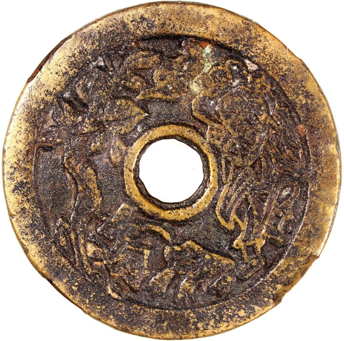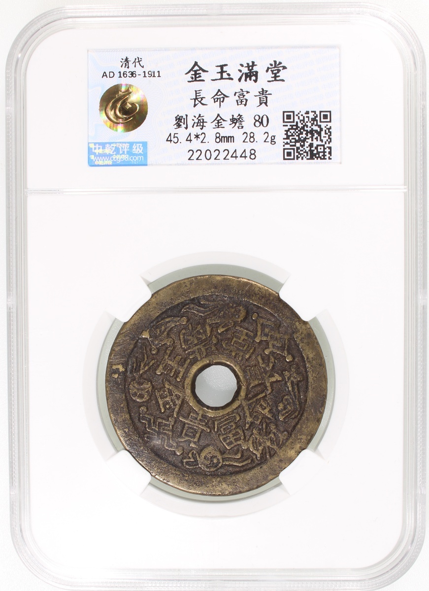 長命富貴金玉滿堂圓穿花錢,背劉海戲蟾,清朝(公元1644–1911),45.4*2.8mm,重28.2g,中乾80。少見品種。好品。
