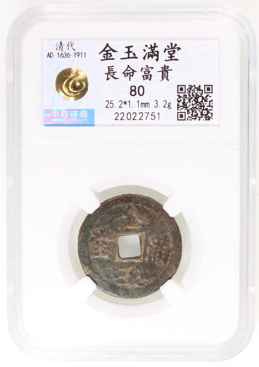 長命富貴方孔花錢,背“金玉满堂”,清朝(公元1644–1911),25.2*1.1mm,重3.2g,中乾80。