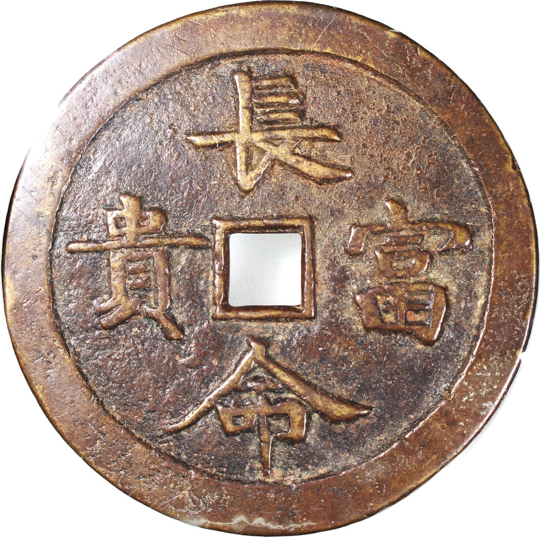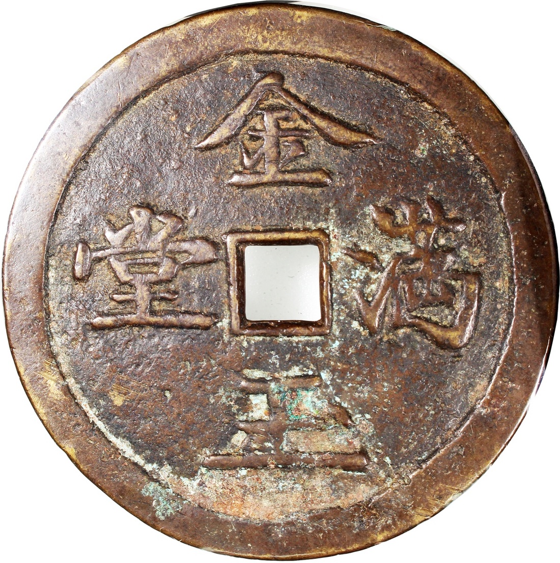 China: Qing Dynasty (1644-1911 CE), coin-shaped charm, obverse inscribed 'Chang ming fu gui', reverse inscribed 'Jin yu man tang', 65.1*2.8mm, 56.5g, Zhong Qian 82. Very rare.