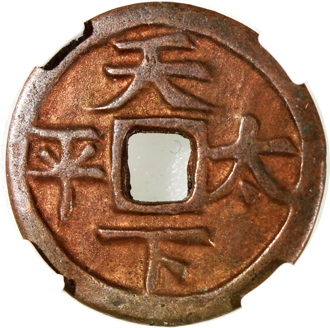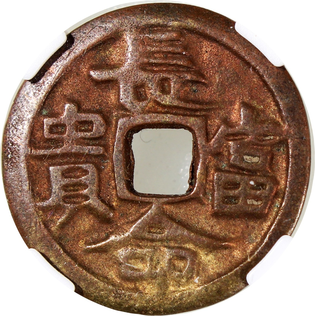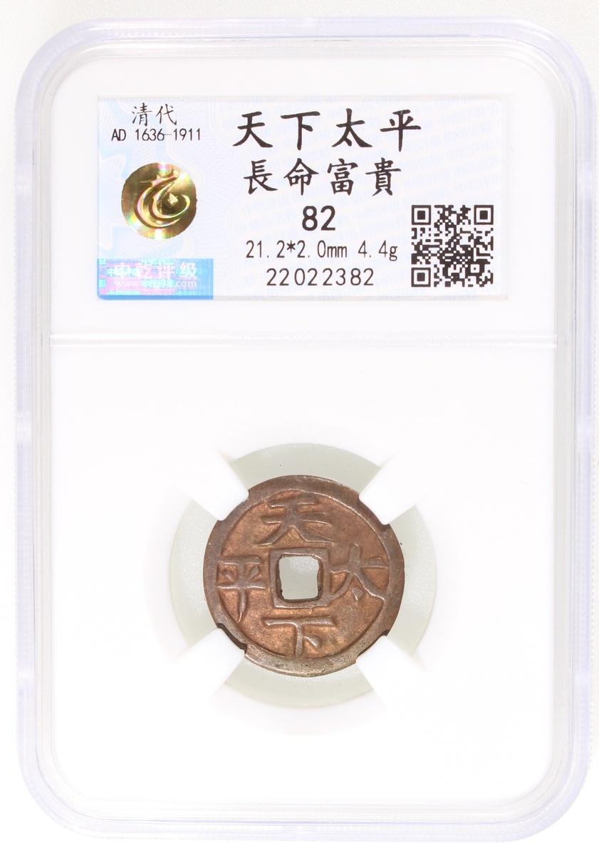 粵爐長命富貴方穿花錢,背“天下太平”,清朝(公元1644–1911),21.2*2.0mm,重4.4g,中乾82。品相上佳。