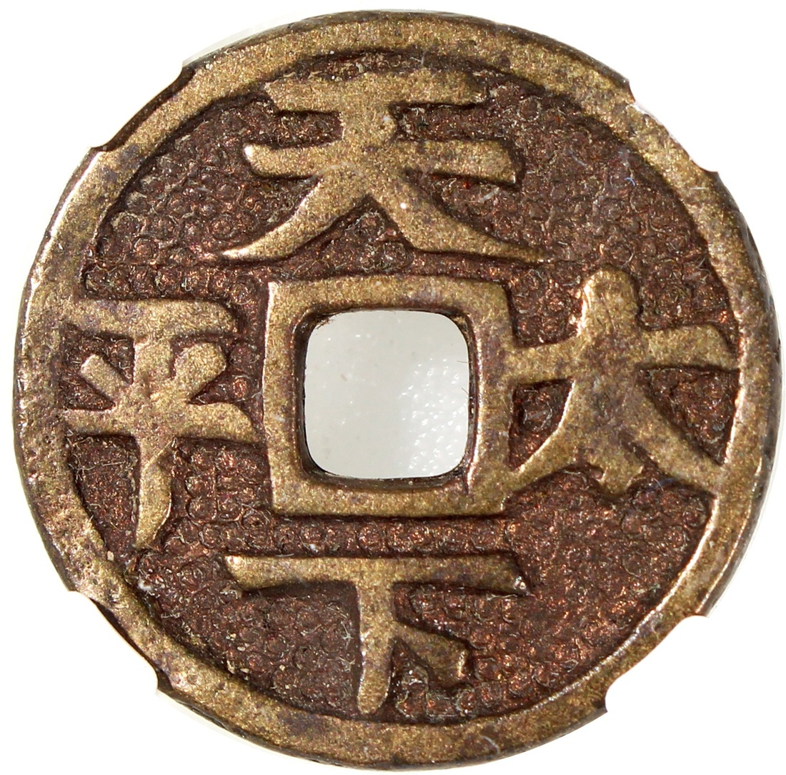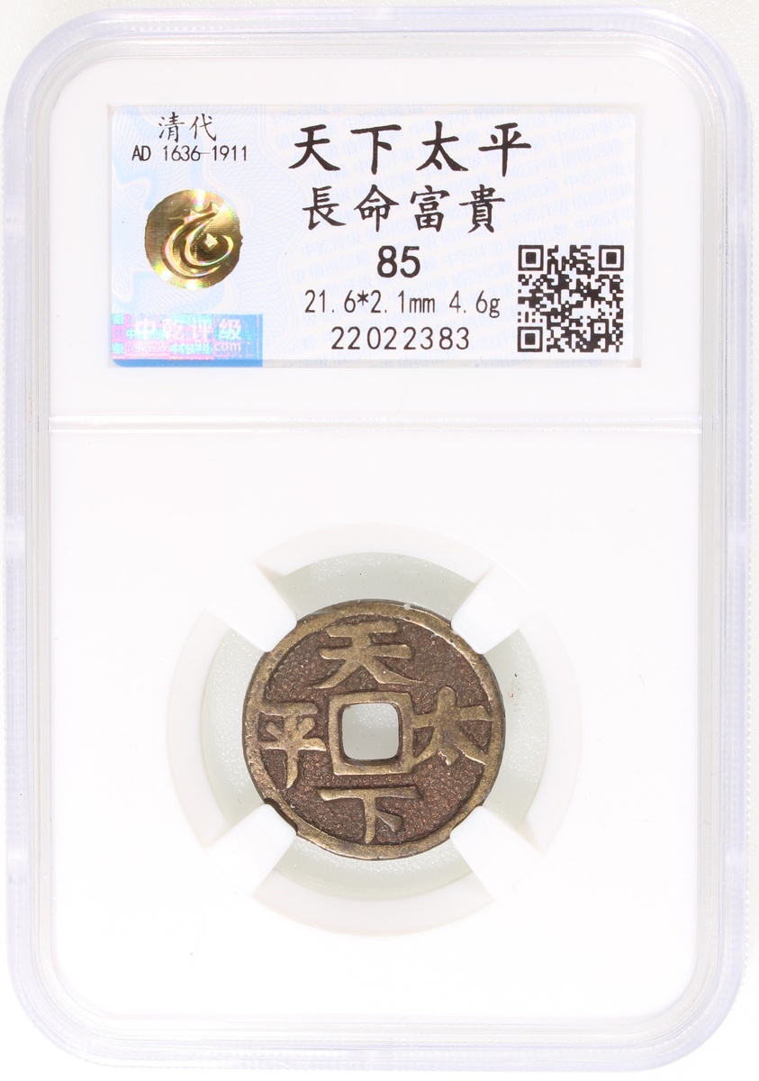 粵爐長命富貴方穿花錢,背“天下太平”,清朝(公元1644–1911),21.6*2.1mm,重4.6g,中乾85。此品通體魚子地,亮麗悅目,品相極美,罕見。