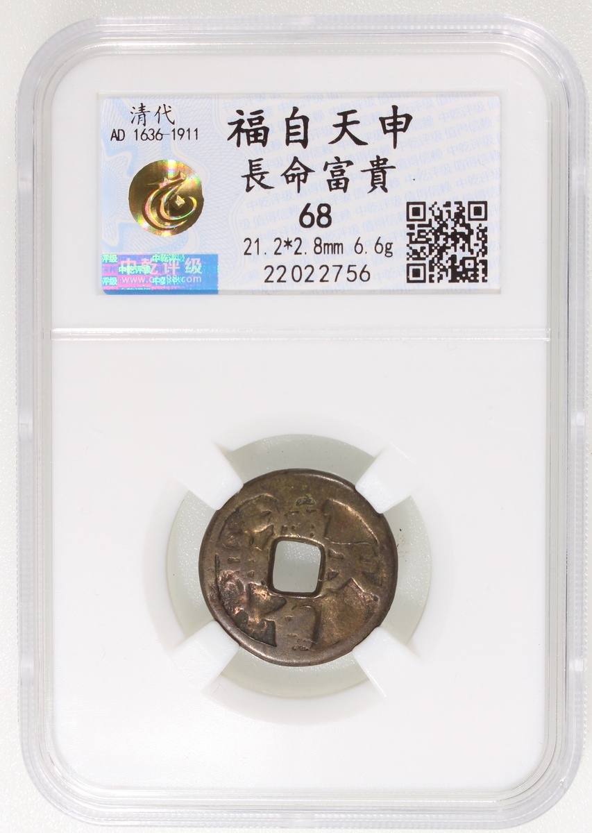 粵爐長命富貴方孔花錢,背“福自天申”,清朝(公元1644–1911),21.2*2.8mm,重6.6g,中乾68。