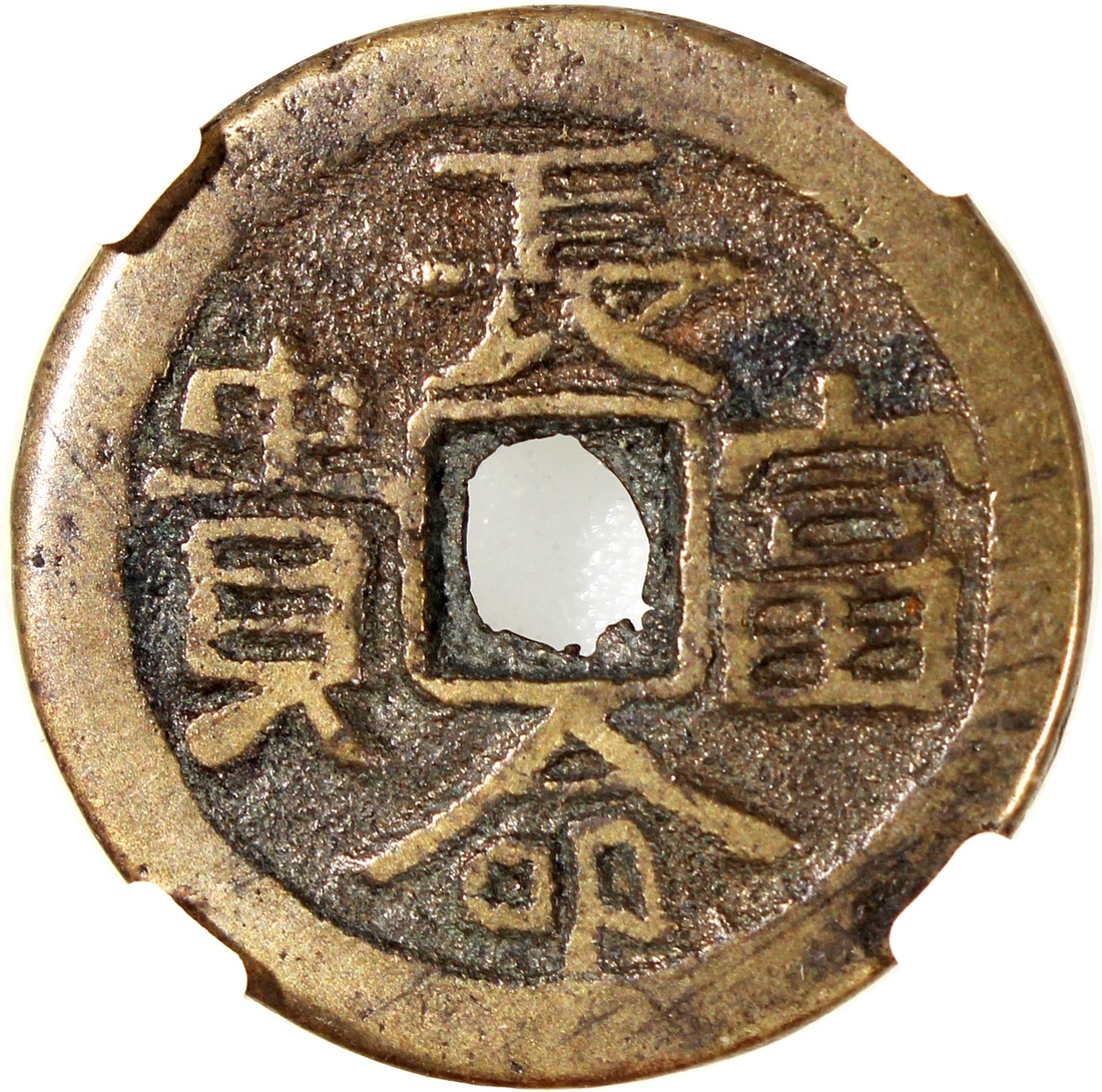 China: Qing Dynasty (1644-1911 CE), coin-shaped charm with square central hole, obverse inscribed 'Chang ming fu gui', reverse inscribed 'Jin qian man di', 25.2*2.2mm, 7.4g, Zhong Qian 82. Rare.
