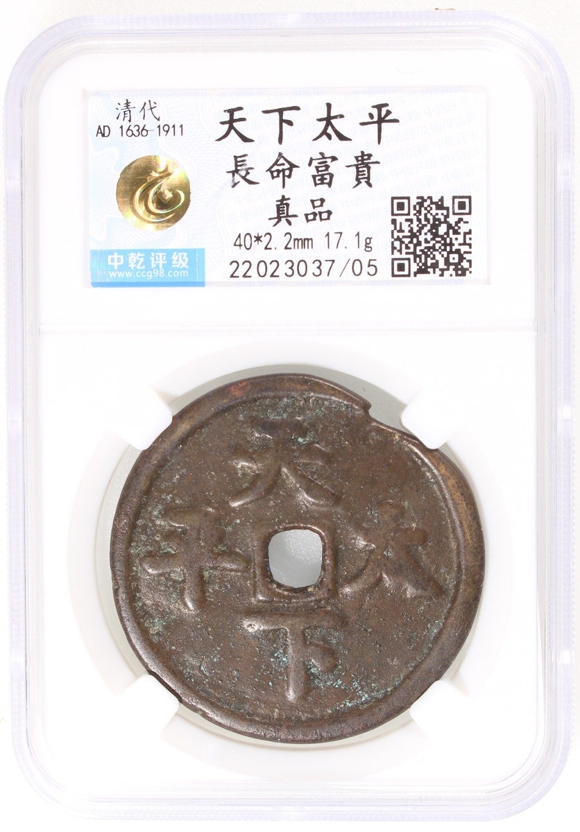 長命富貴方穿花錢,背天下太平,清朝(公元1644–1911),40*2.2mm,重17.1g,中乾真品。