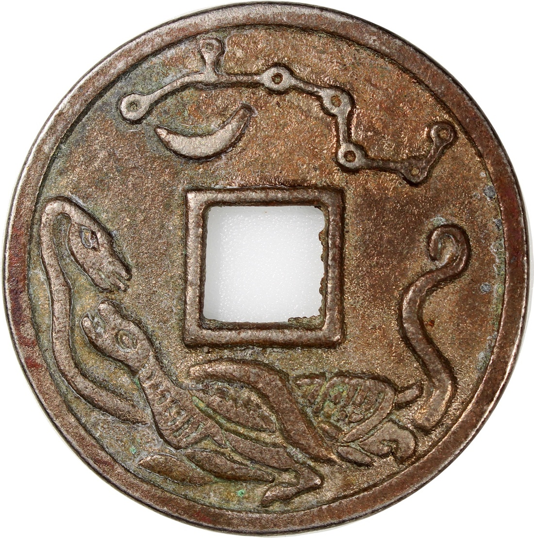 長壽符篆方孔花錢,背星月龜蛇,民國(公元1911–1949),51.8*2.9mm,重38.9g。上佳好品。