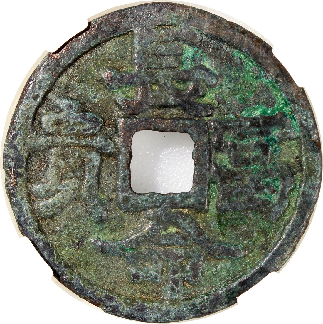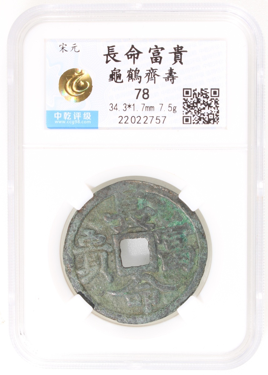 長命富貴方孔花錢,背龜鶴齊壽圖,宋元(公元960–1368)時期,34.3*1.7mm,重7.5g,中乾78。上佳好品。