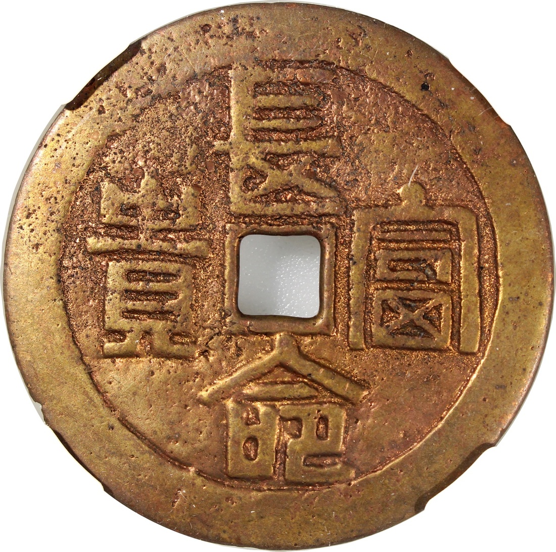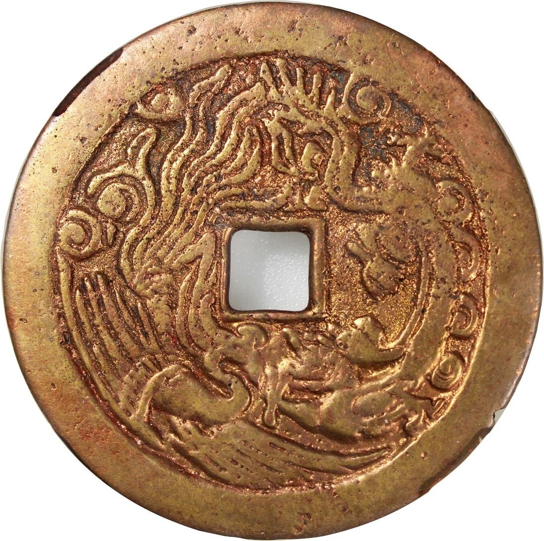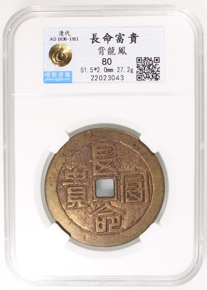 貴爐長命富貴方穿花錢,背龍鳳,清朝(公元1644–1911),51.5*2.0mm,重27.2g,中乾80。品相極美,少見。