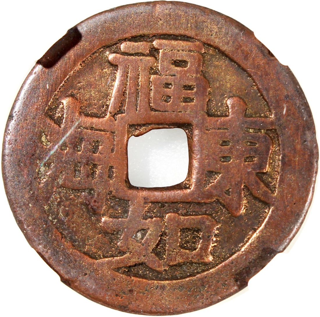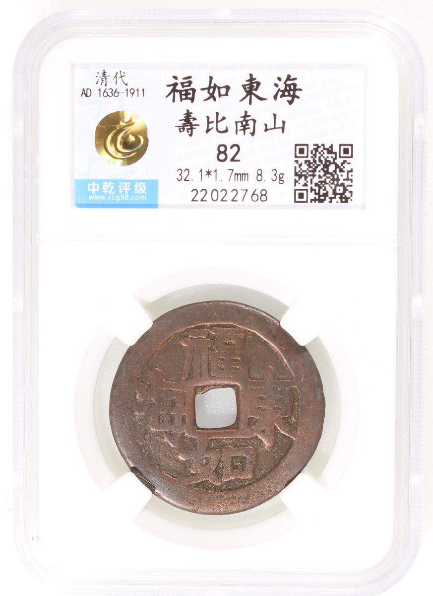 China: Qing Dynasty (1644-1911 CE), coin-shaped charm with square central hole, Guizhou mint production, obverse inscribed 'Fu ru dong hai', reverse inscribed 'Shou bei nan shan', 32.1*1.7mm, 8.3g, Zhong Qian 82.