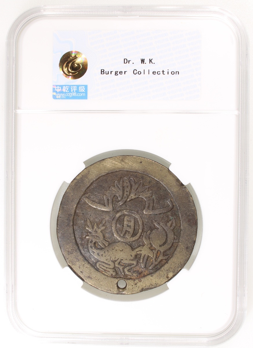 China: Qing Dynasty (1644-1911 CE), coin-shaped charm without central hole, a Guizhou mint production, obverse inscribed 'Fu ru dong hai shou bi nan shan', reverse inscribed 'Yue' showing bat, deer and peach, 49.5*2.3mm, 34.1g, Zhong Qian Genuine. Note: This piece is of an exceptional quality, which applies to both the coin body itself as well as the inscriptions and the pictorial representations on the back, most superbly executed. It uses the characters Shou and Yue in the central position, representing an unusual design. Of particular interest is the encircled character 'Yue' on the reverse, an entriguing treatment with unidentified meaning. It is possible that this piece may have been custom made to commemorate a special birthday celebration. Overall, this piece represents an extremely rare and nice example produced by the Guizhou mint.