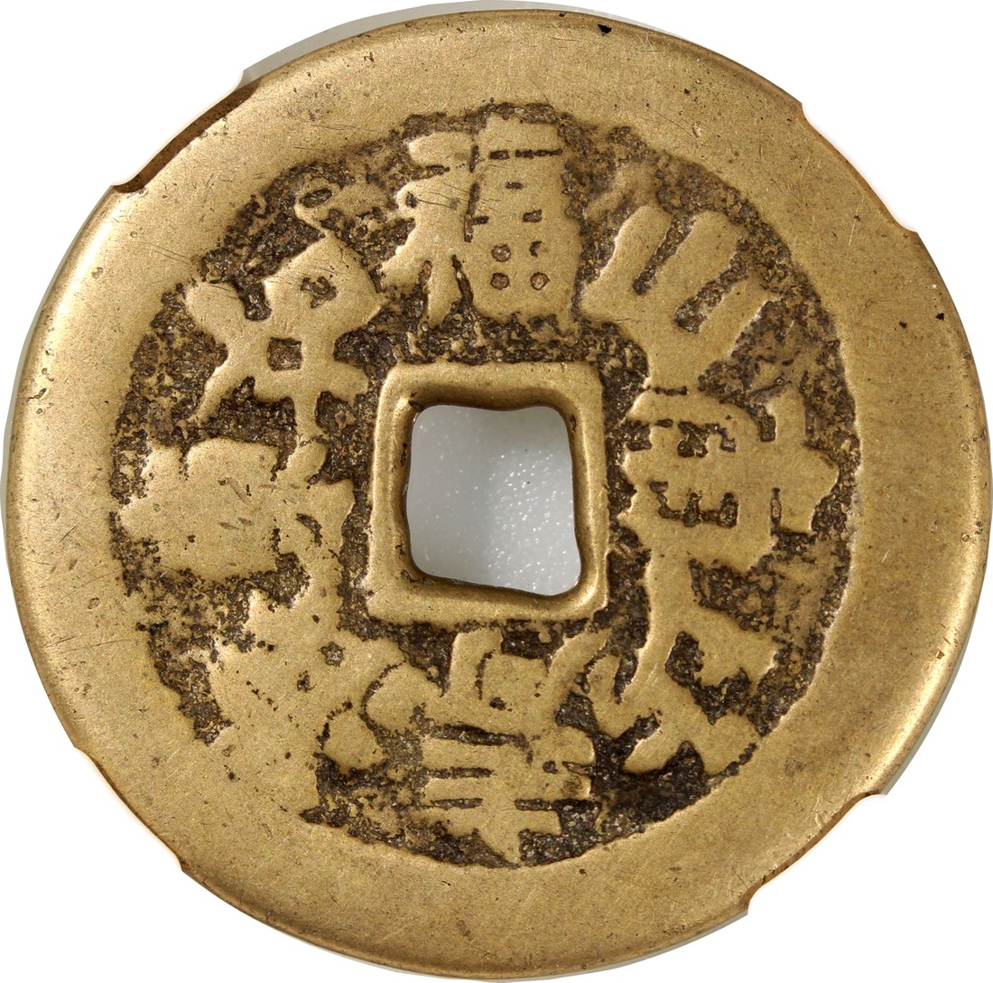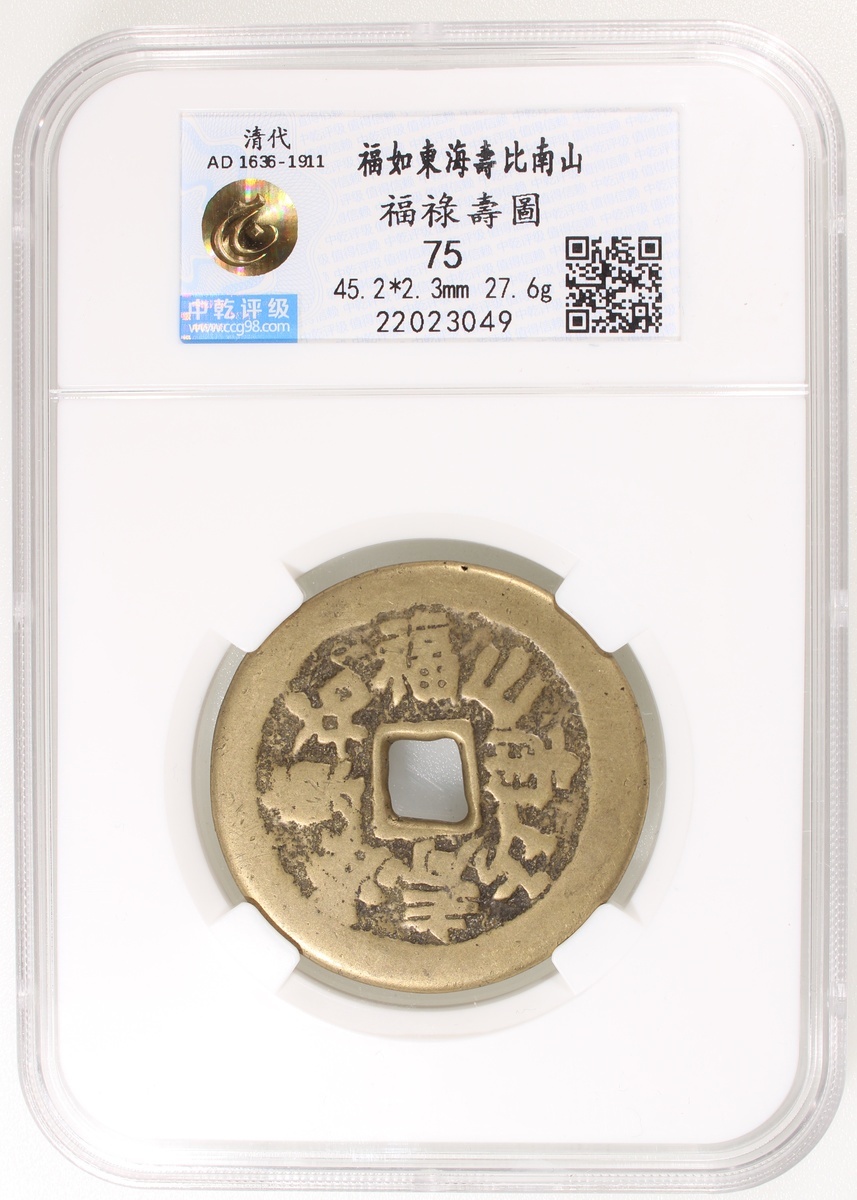 China: Qing Dynasty (1644-1911 CE), coin-shaped charm with square central hole, obverse inscribed with 'Fu ru dong hai shou bi nan shan', reverse showing bat and deer, 45.2*2.3mm, 27.6g, Zhong Qian 75. Rare.