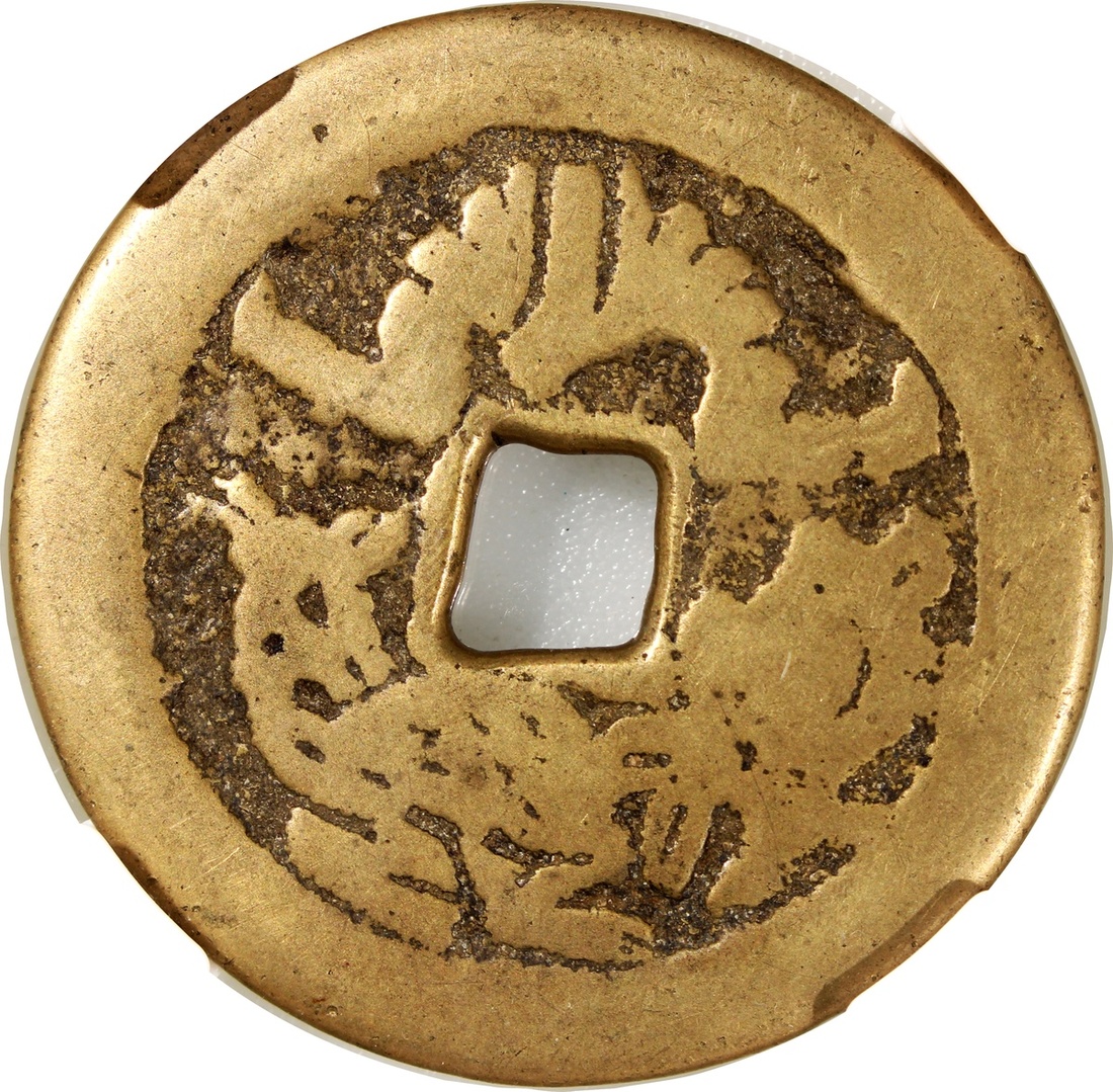 福如東海壽比南山方穿花錢,背蝠鹿桃,清朝(公元1644–1911),45.2*2.3mm,重27.6g,中乾75。少見。