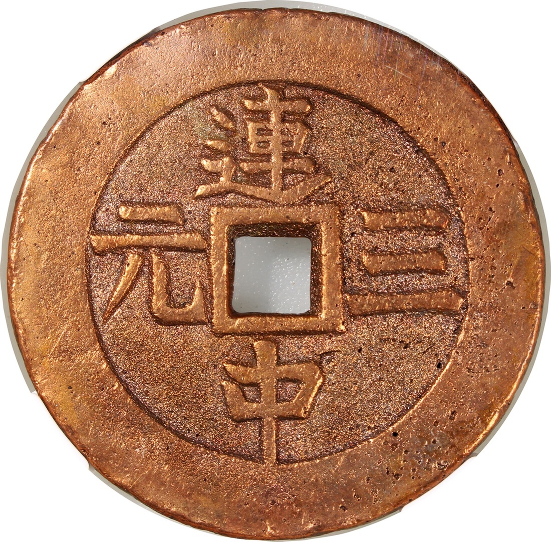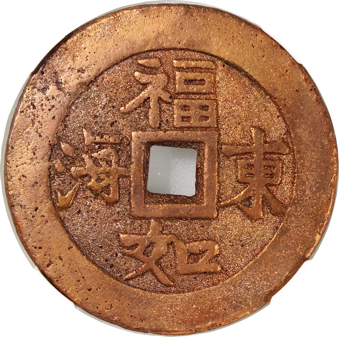 China: Qing Dynasty (1644-1911 CE), coin-shaped charm with square central hole, obverse inscribed with 'Fu ru dong hai', reverse inscribed 'Lian zhong san yuan', 50.6*3.2mm, 43.7g, Zhong Qian 82. Extremely fine, extremely rare.