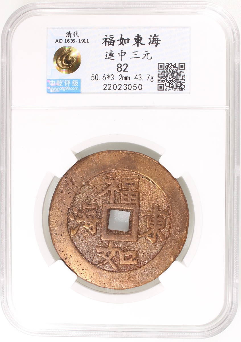 福如東海方穿花錢,背連中三元,清朝(公元1644–1911),50.6*3.2mm,重43.7g,中乾82。品相極美,極少見。