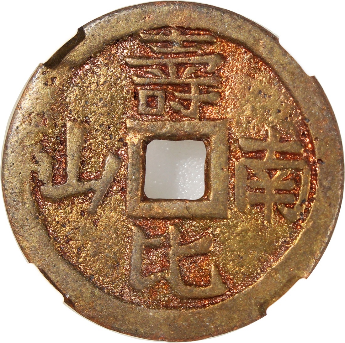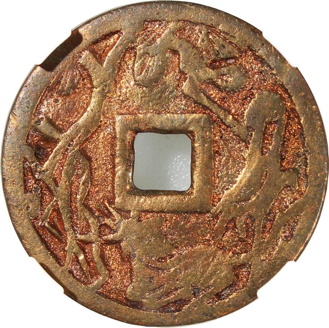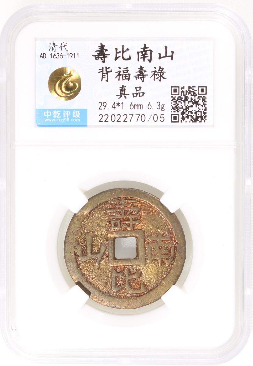 壽比南山方孔花錢,背鶴鹿圖,清朝(公元1644–1911),29.4*1.6mm,重6.3g,中乾真品。