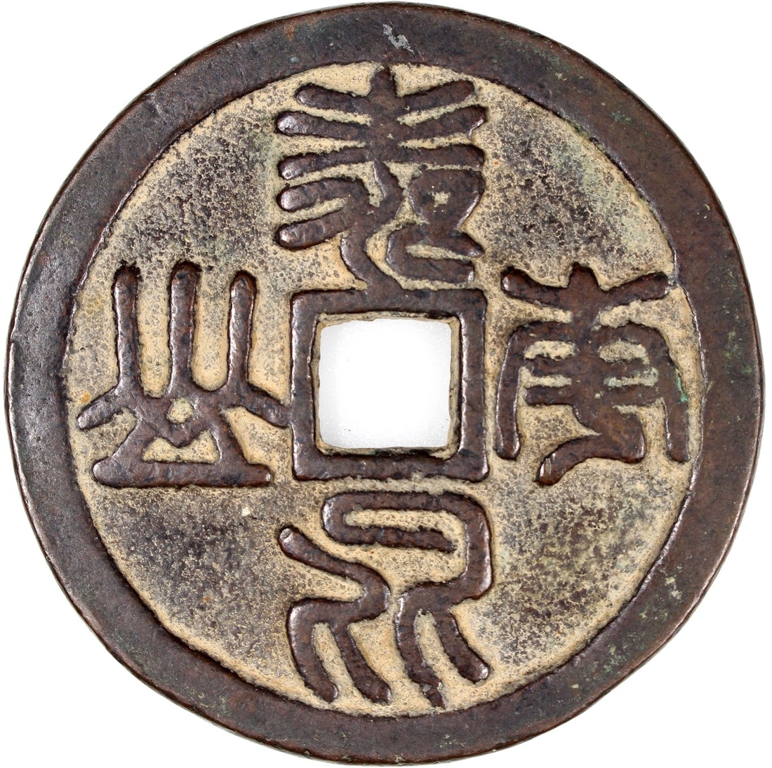 China: Qing Dynasty (1644-1911 CE), coin-shaped charm with square hole, obverse inscribed 'Shou bi nan shan' in seal script, reverse showing dragon and phoenix, 55.1*3.3mm, 54.1g. Extremely fine, rare.