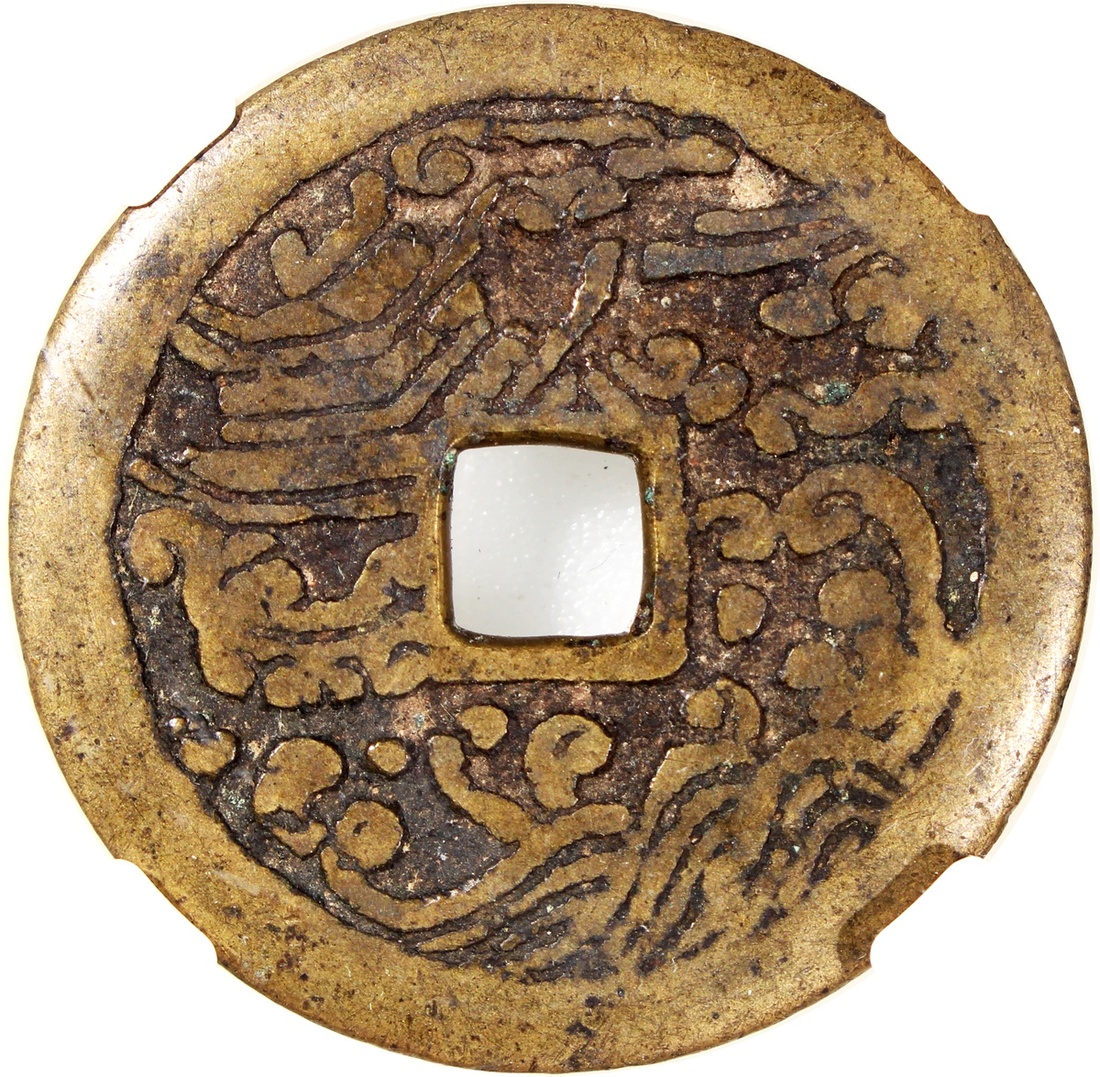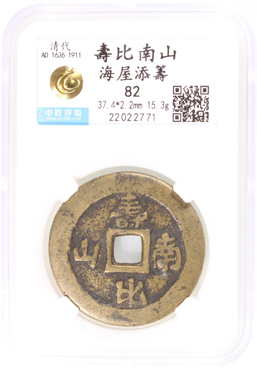 貴爐壽比南山方孔花錢,背海屋添籌圖,清朝(公元1644–1911),37.4*2.2mm,重15.3g,中乾82。品相極美。