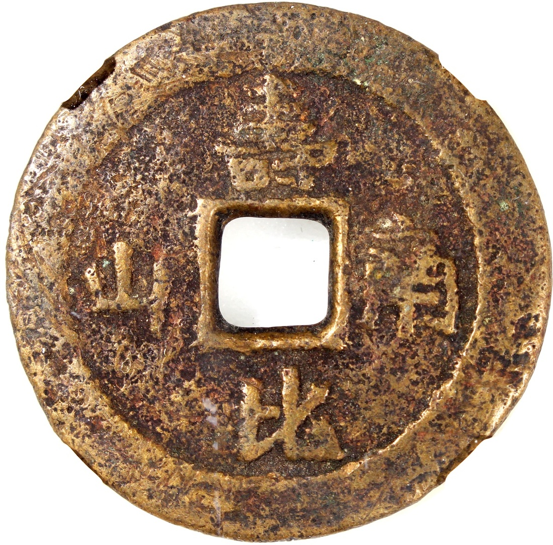 貴爐壽比南山方穿花錢,背海屋添籌圖,清朝(公元1644–1911),39.8*1.9mm,重14.5g,中乾78。该版大樣,直徑達39.8mm,普通品多為37.5mm(見上品),外緣旋紋清晰可見,圖案精美,罕見。