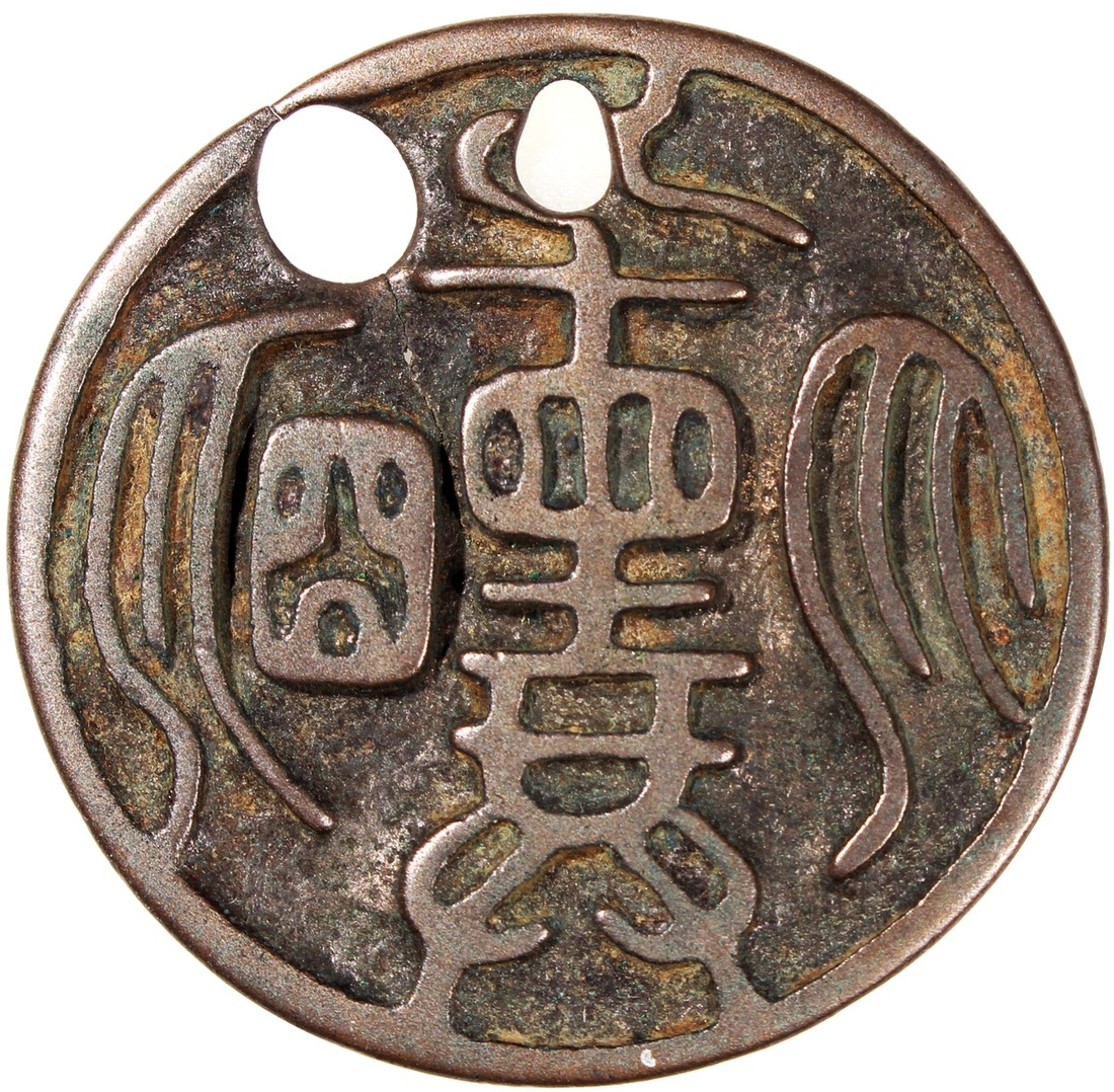China: Yuan-Ming (1271-1644 CE), coin-shaped charm with holes on top, obverse inscribed unknow character in seal script, reverse plain, 36.9*1.3mm, 11.2g. Extremely rare.