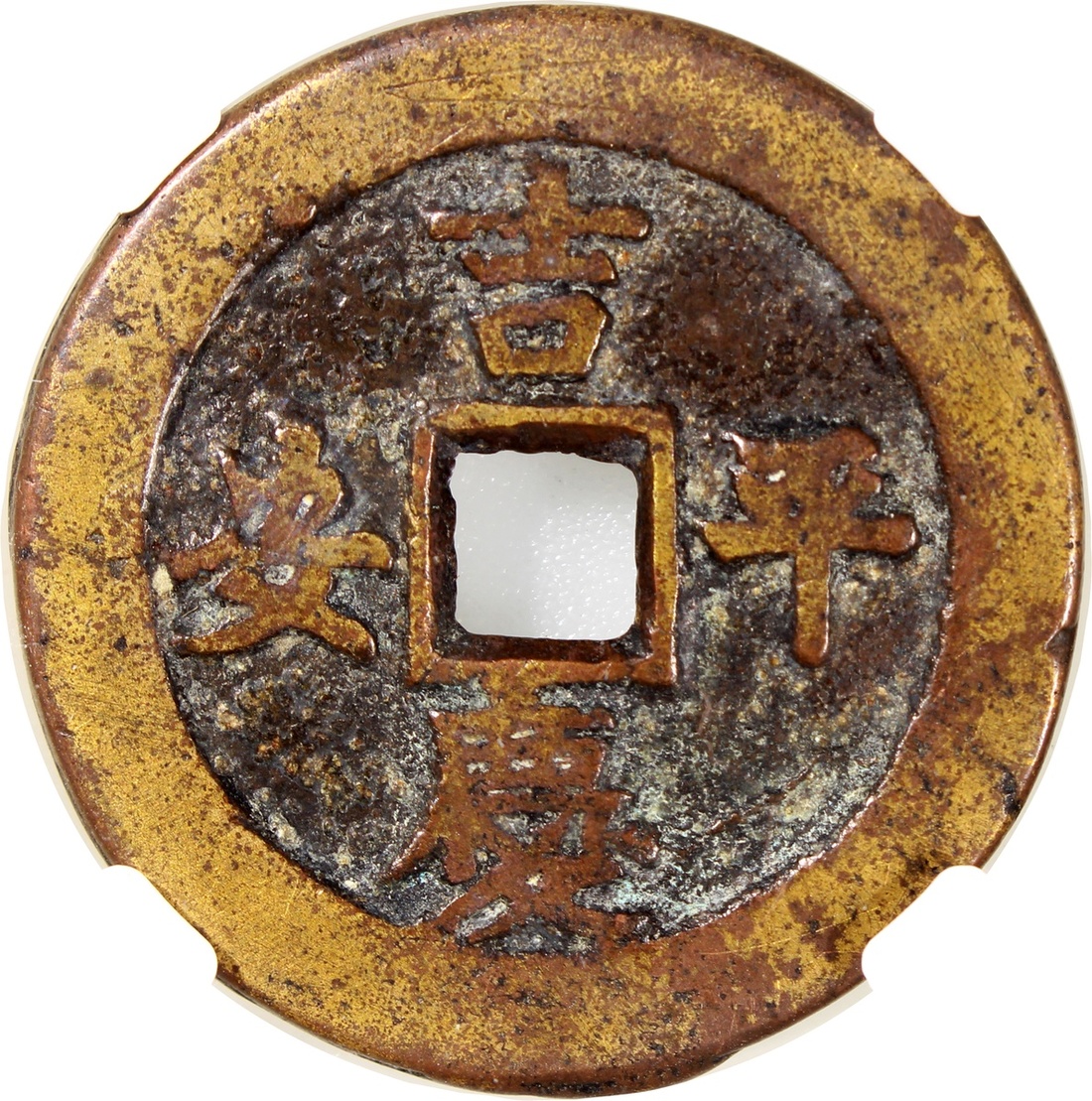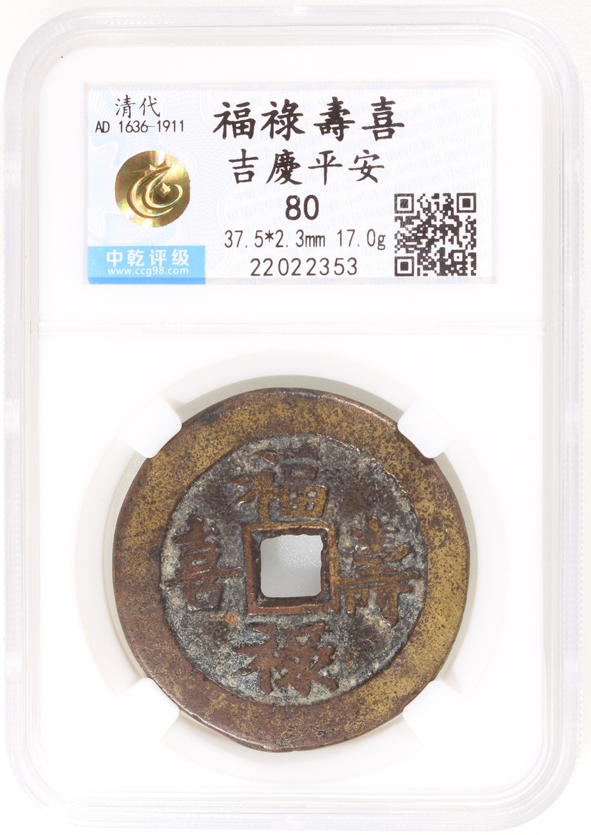 China: Qing Dynasty (1644-1911 CE), coin-shaped charm with square hole, obverse inscribed 'Fu lu shou xi', reverse inscribed 'Ji qing ping an', 37.5*2.3mm, 17.0g, Zhong Qian 80. Rare, nice patina.